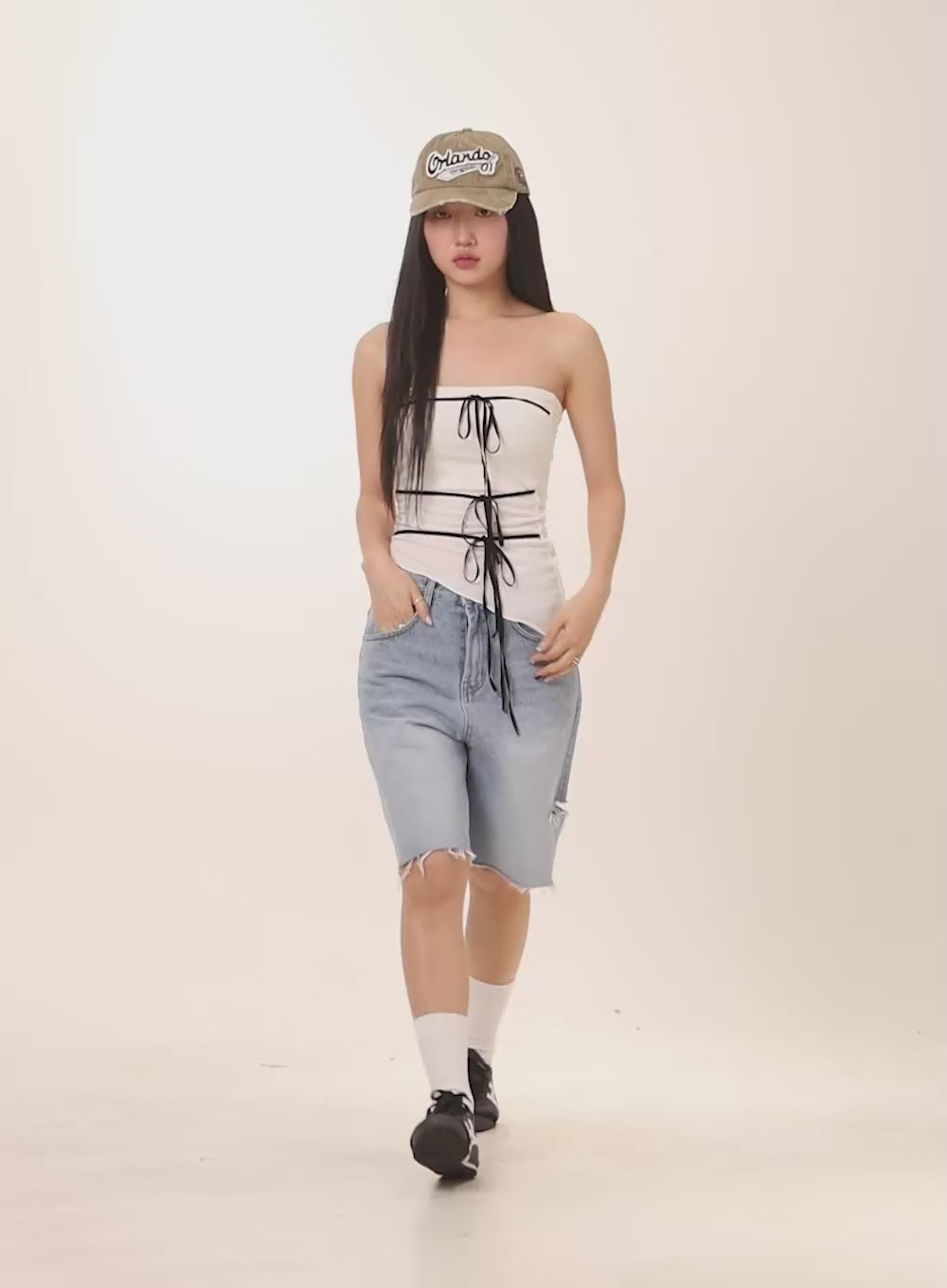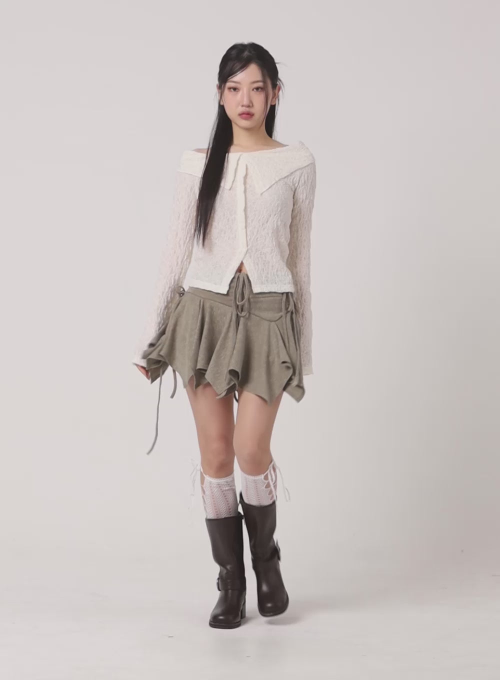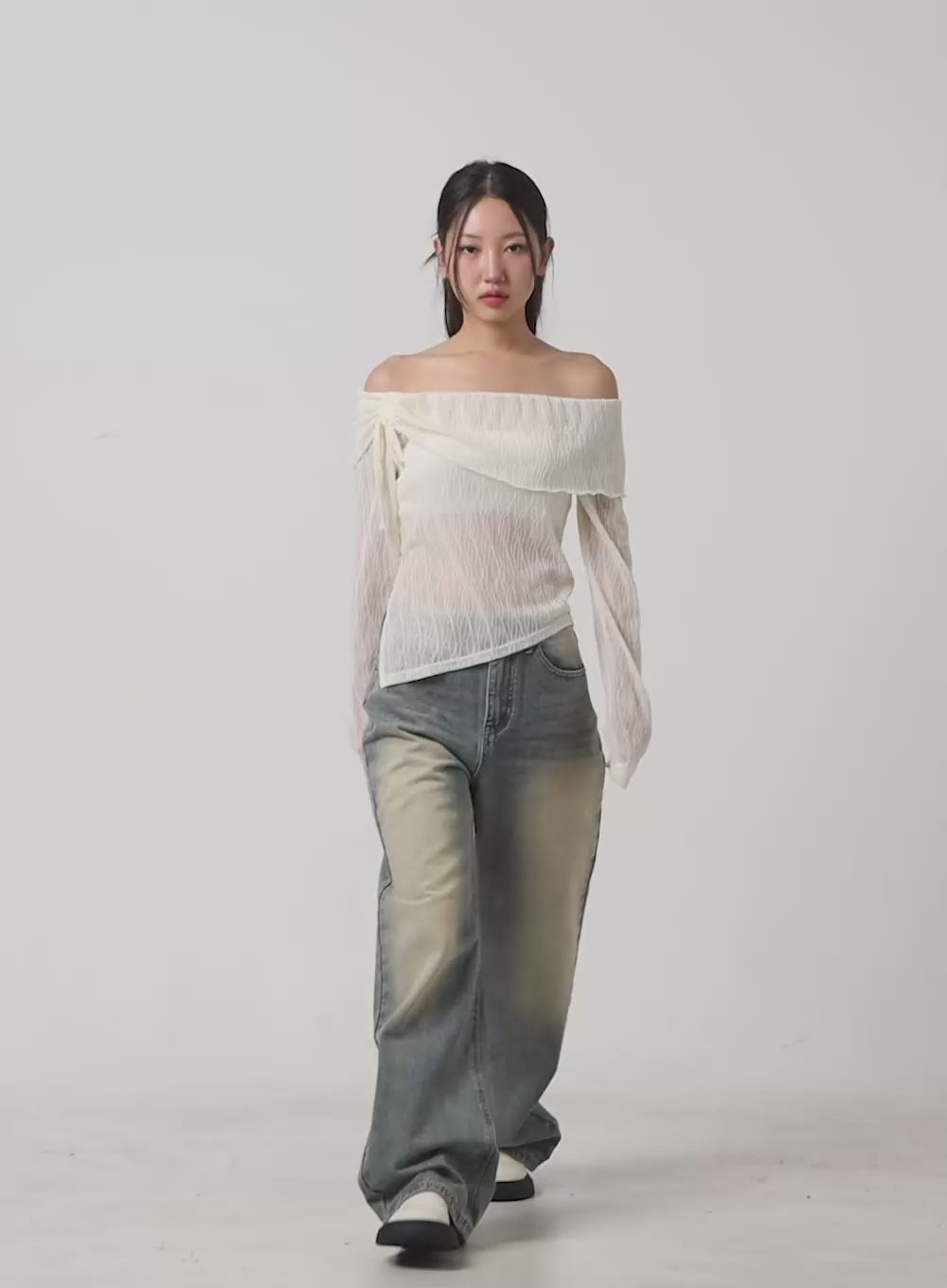 Snow white off-shoulder sweater radiates delicate charm with its ribbon accents, giving a subtle nod to coquette styling.
