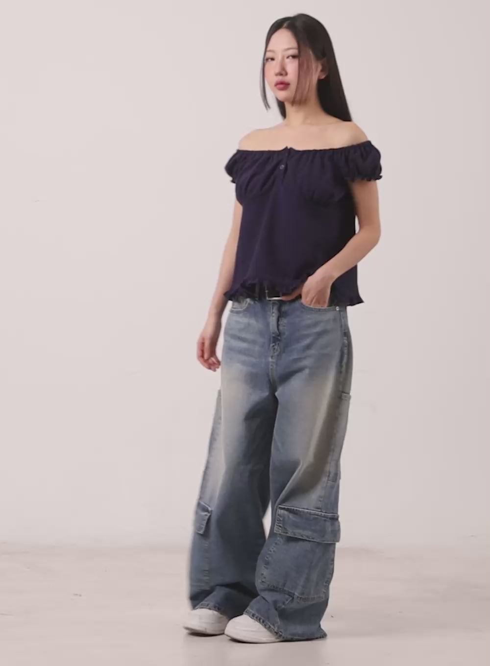 frill-buttoned-off-shoulder-blouse-top-im528 / Dark blue