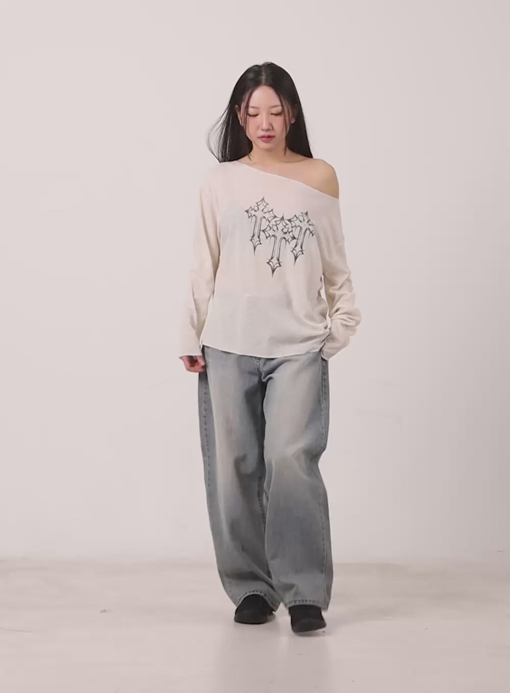 one-shoulder-sheer-long-sleeve-graphic-top-im528 / Light beige