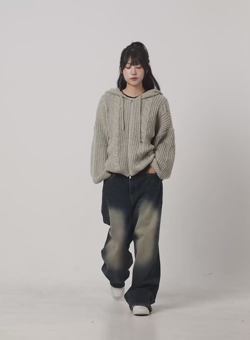 oversized-cable-knit-zip-up-hooded-sweater-cg421 / Light beige