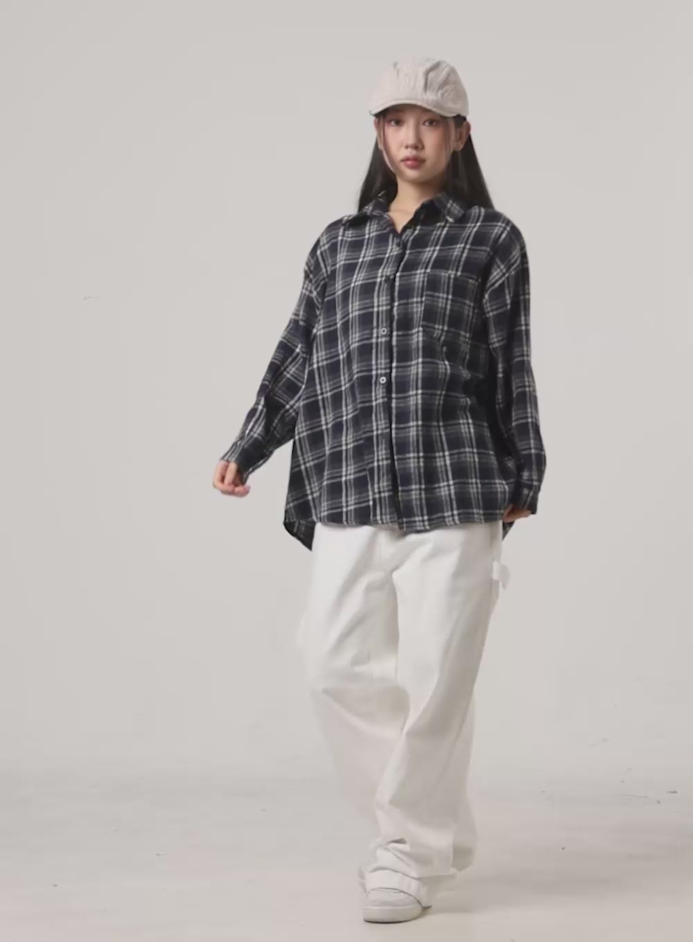 buttoned-long-sleeve-check-blouse-cn406 / Dark blue