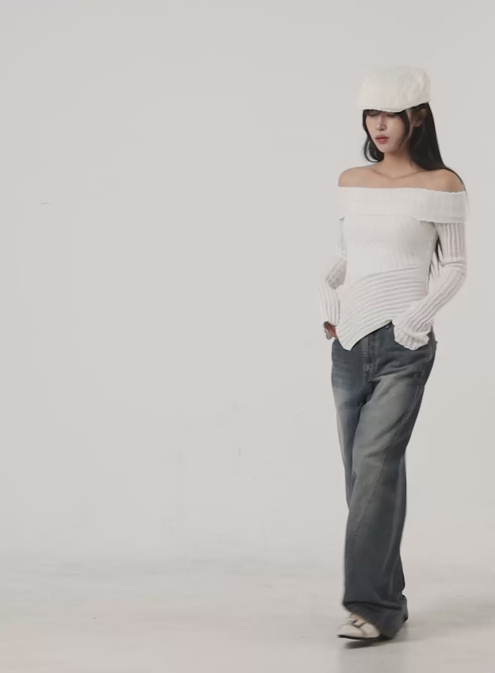 unbalanced-long-sleeve-off-shoulder-top-co418 / White