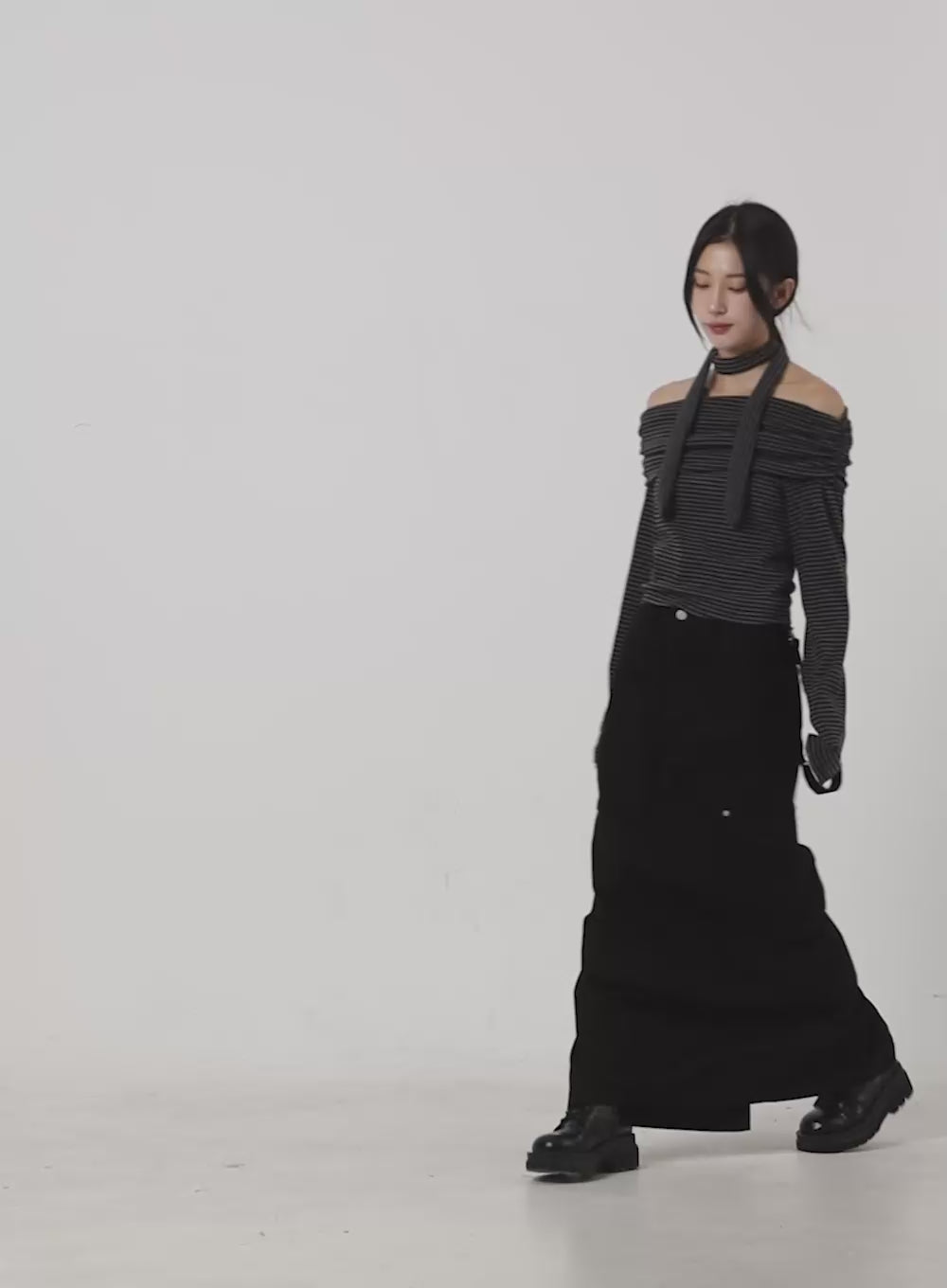 striped-off-shoulder-crop-top-scarf-set-cs430 / Black