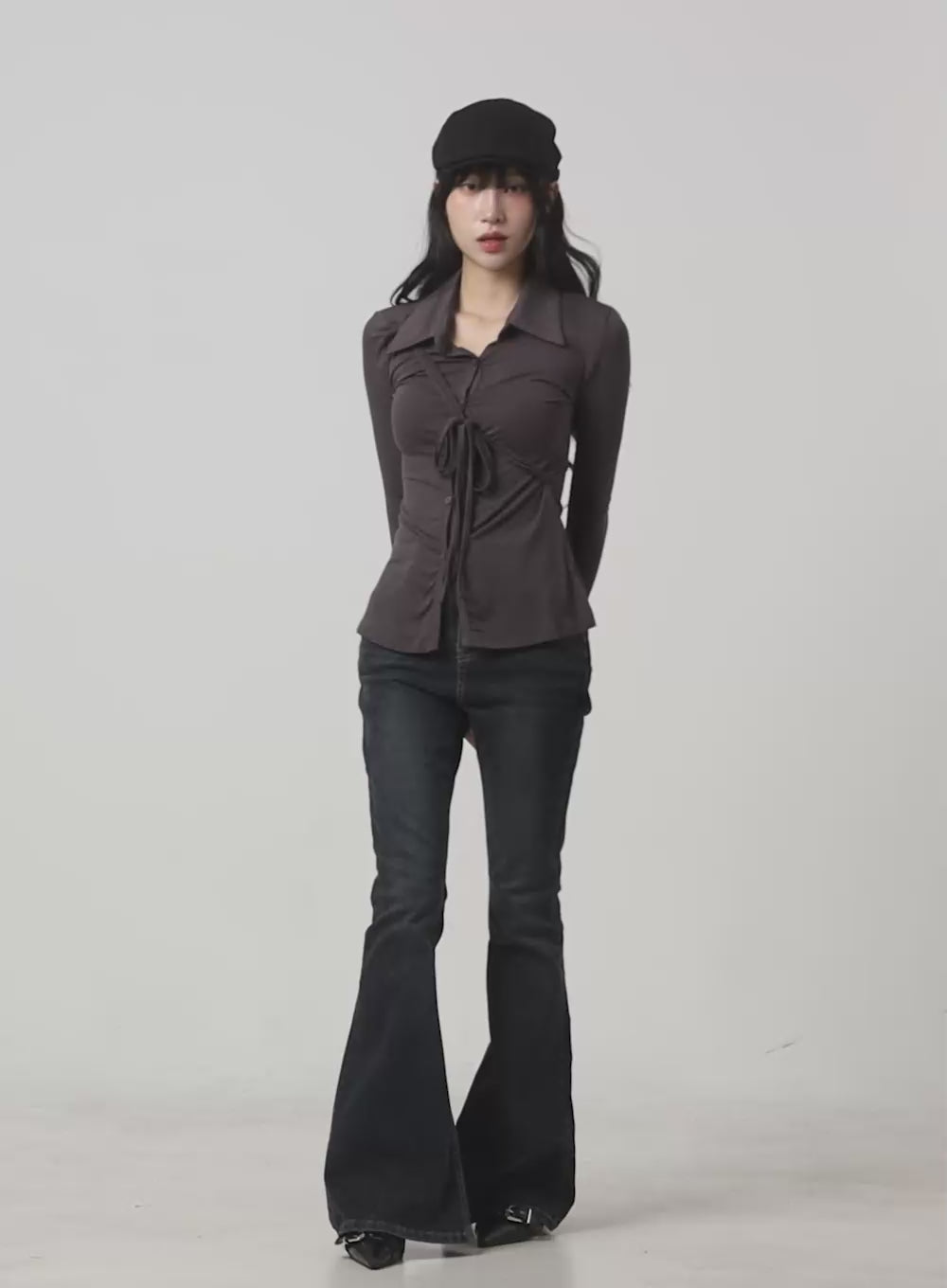 long-sleeve-slim-tie-collar-top-cg421 / Dark gray