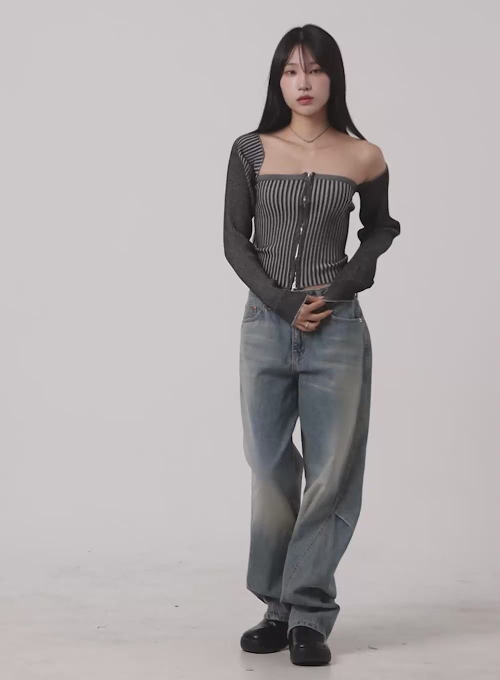 stripe-off-shoulder-top-cy526 / Dark gray