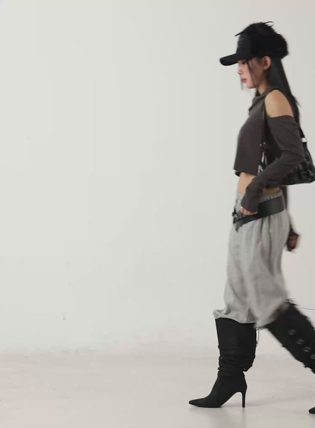 A cropped black bomber jacket, faux leather shorts, and sleek ankle boots combine to form a powerful statement look. Paired with ski poles and a bold attitude, this outfit brings a cyberpunk-inspired twist to traditional winterwear. Designed for those who embrace individuality, it’s the perfect choice for making a locked eyes on the slopes or beyond.