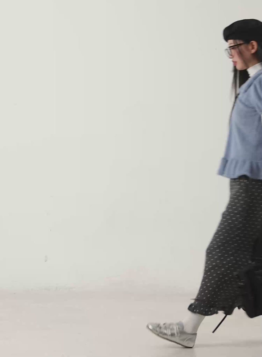 This sleek black high-neck mini dress, paired with silver metallic accessories, creates a striking, modern silhouette. Accented by a shimmering backdrop and delicate snowflakes, the look is an ode to futuristic glamour. Perfect for evening gatherings or après-ski moments, this outfit exudes confidence and sophistication, making it a minimal yet standout piece for the season.