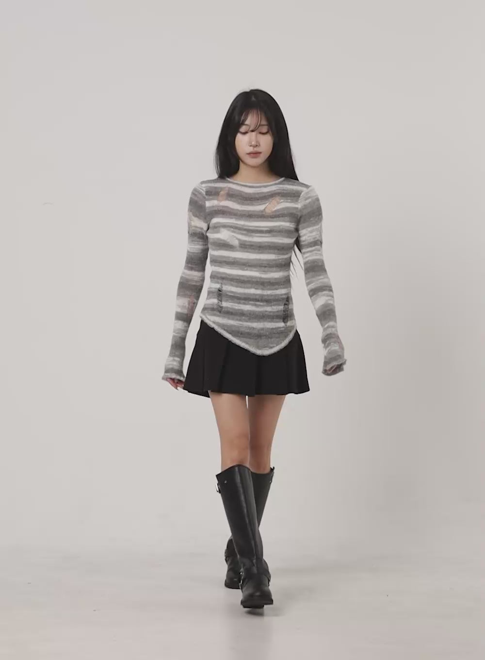 stripe-destroyed-long-sleeve-knit-top-co419 / Light gray