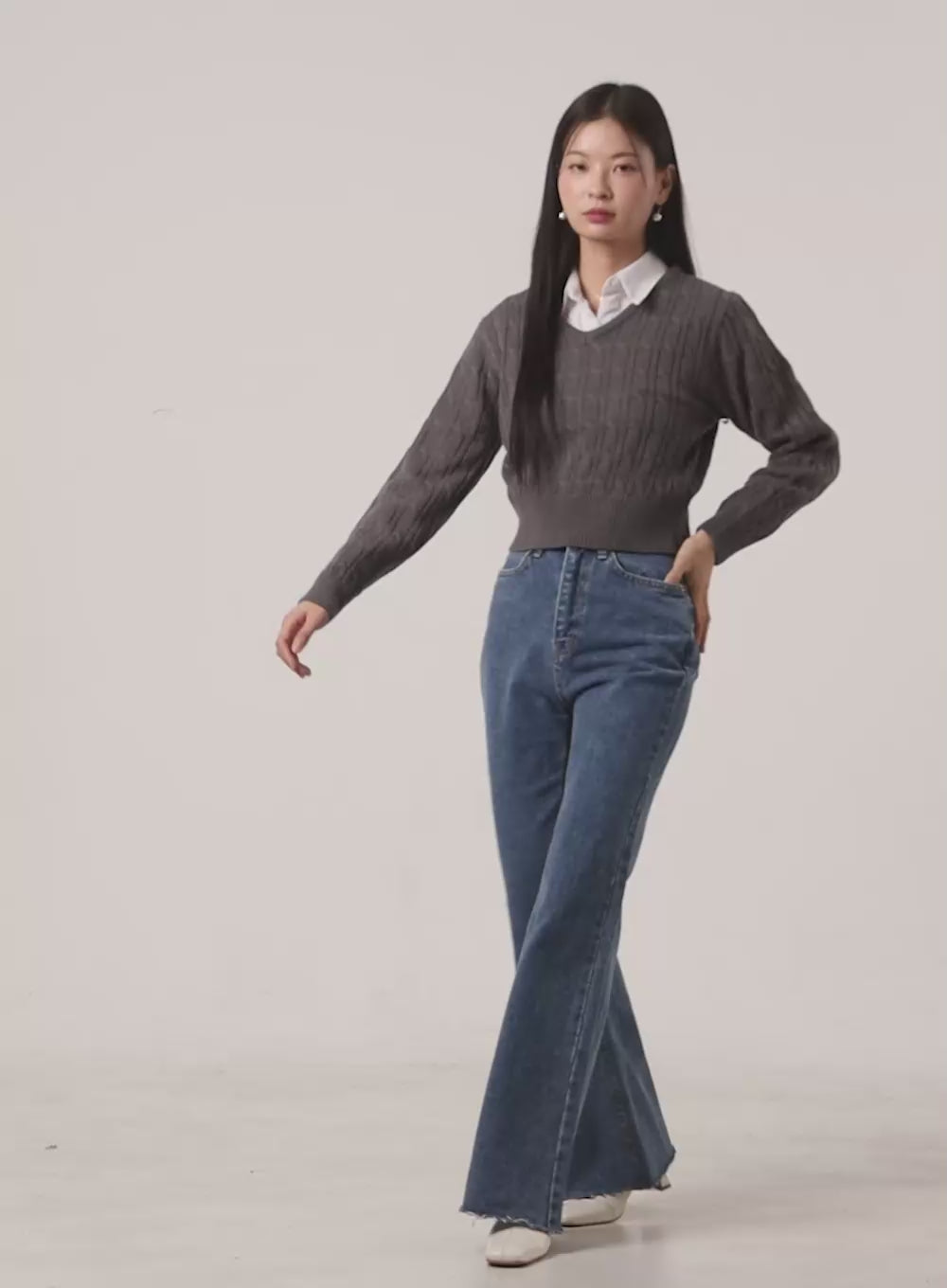 slim-v-neck-cable-knit-sweater-oo416 / Light beige