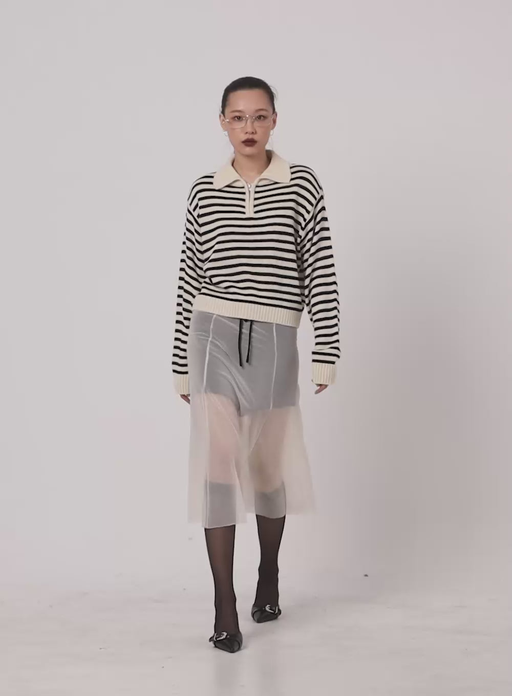 The puffer jacket, styled with ski goggles and chunky sneakers, effortlessly balances functionality and edge. Its clean lines and monochromatic palette create a Y3K look that’s perfect for winter activities or insta-worthy photos. This ensemble encapsulates the collection’s focus on merging comfort with cutting-edge picks.