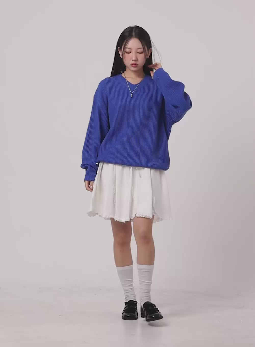 oversized-v-neck-waffle-knit-sweater-oa415 / Blue