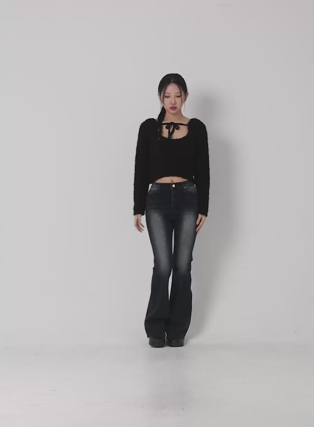 faux-fur-cropped-sweater-with-high-collar-ribbon-cd301 / Black