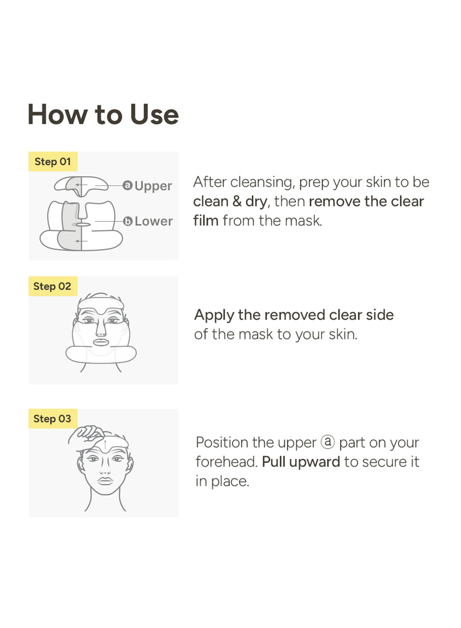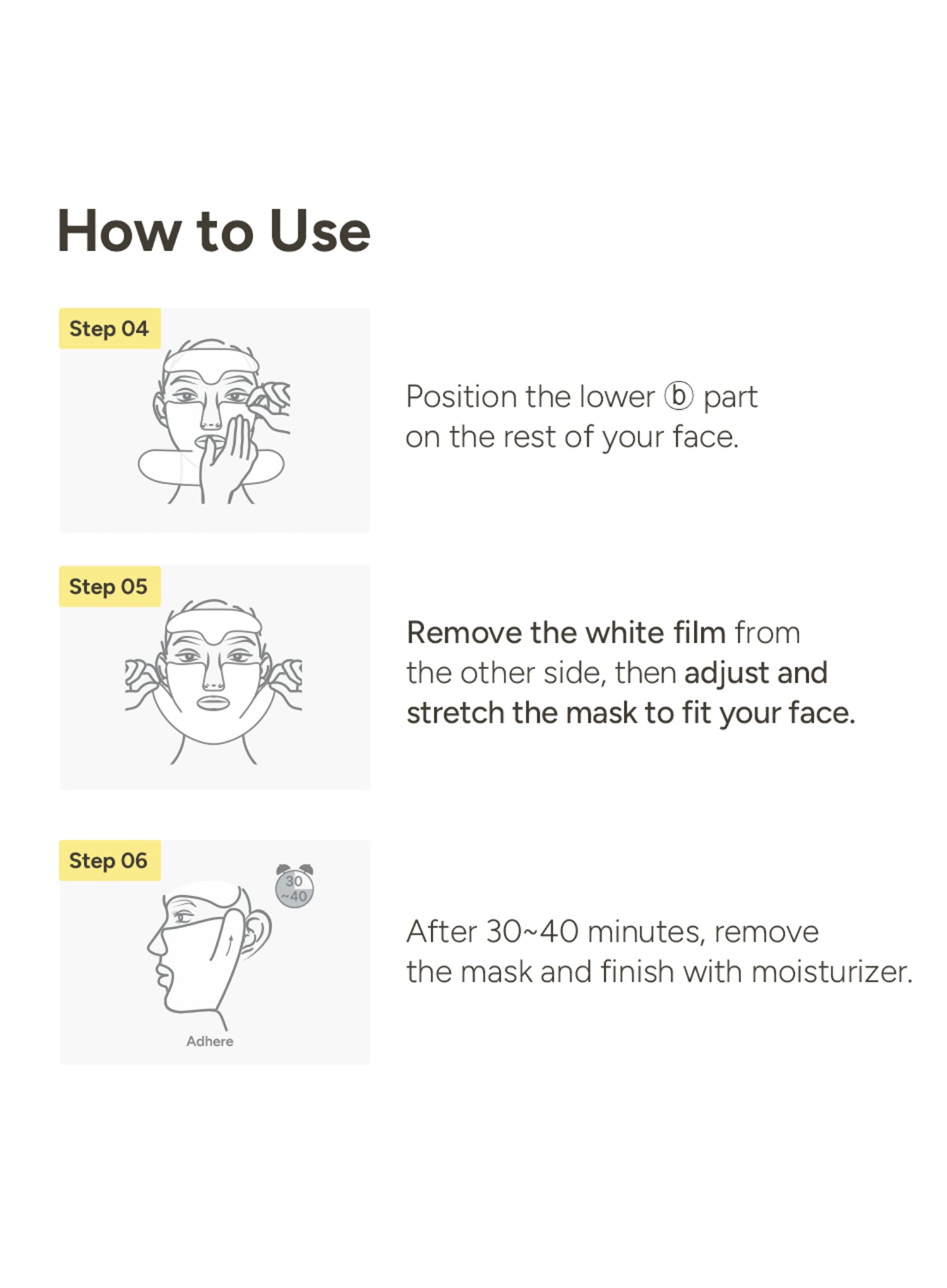 1. Place the mask on the face, avoiding lip & eye areas after prepping with toner.