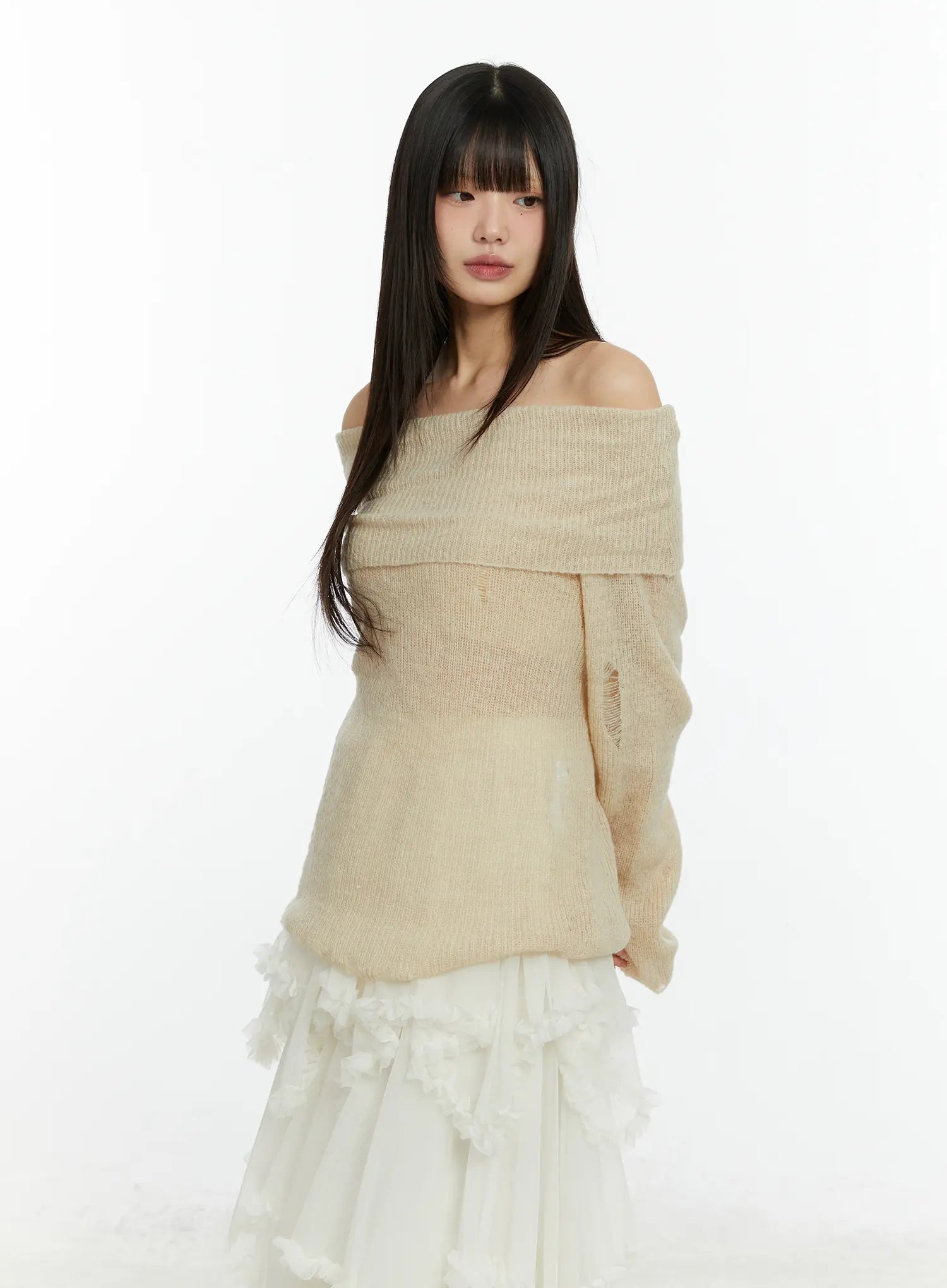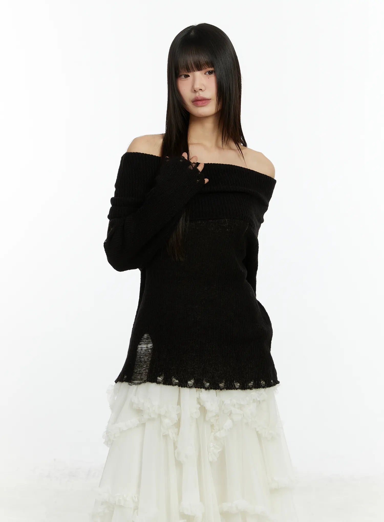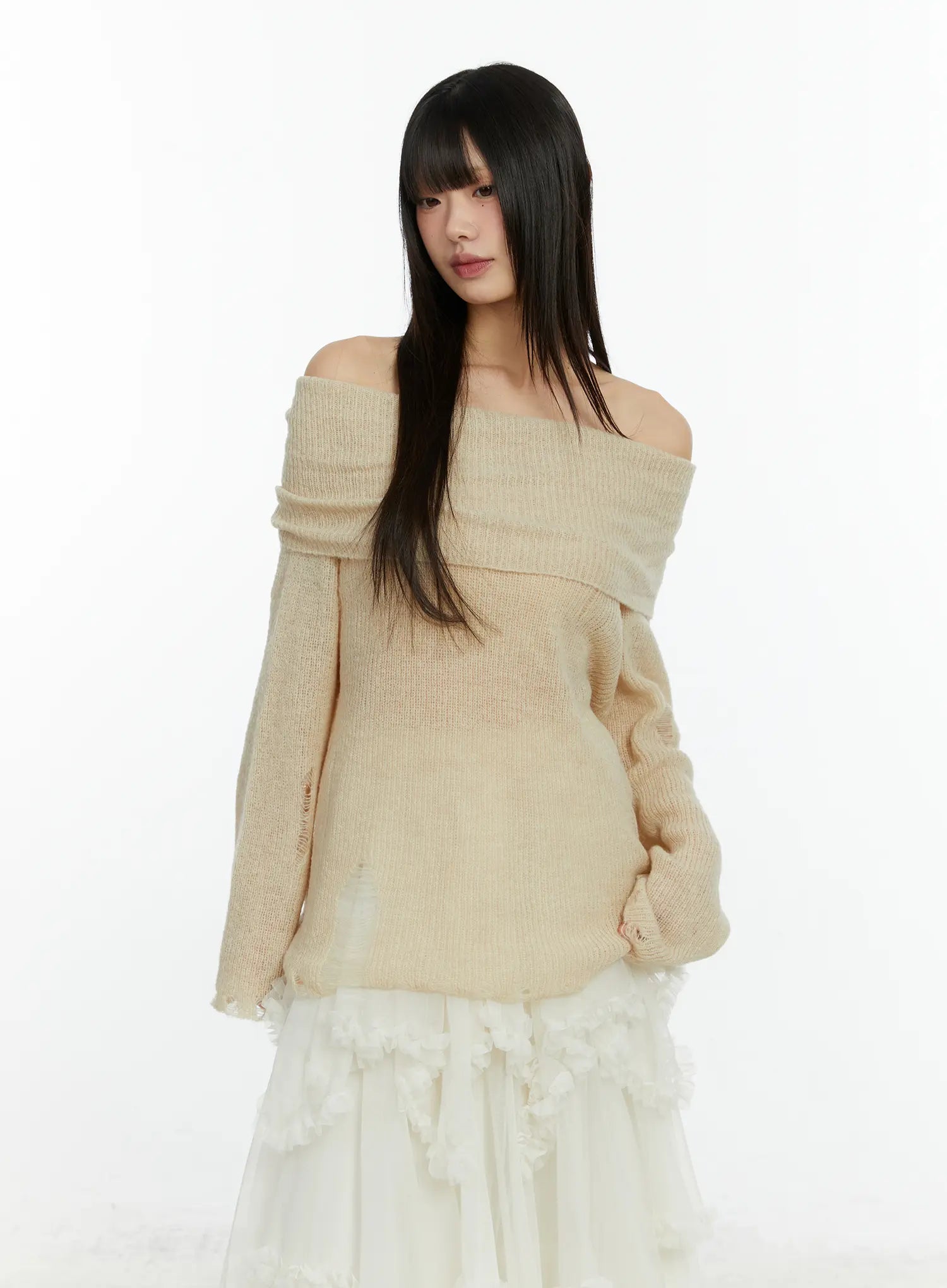Distressed Off-Shoulder Knit Top CF510