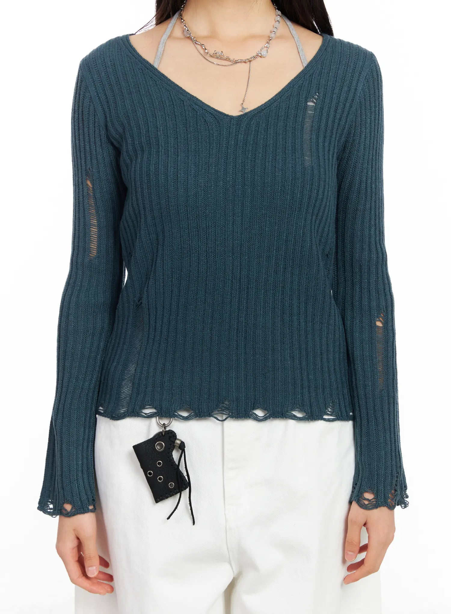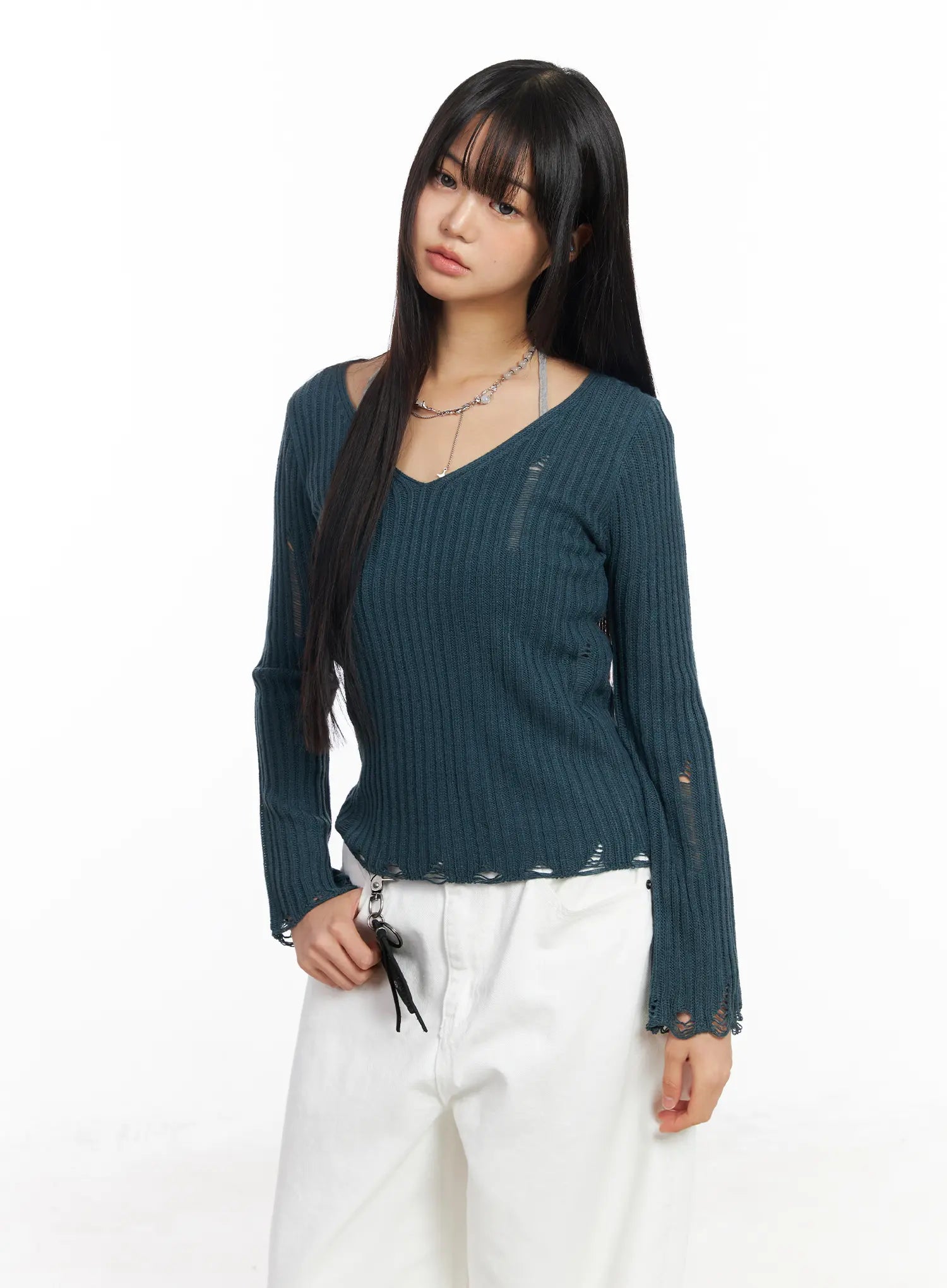 Distressed V-Neck Knit Sweater CF504