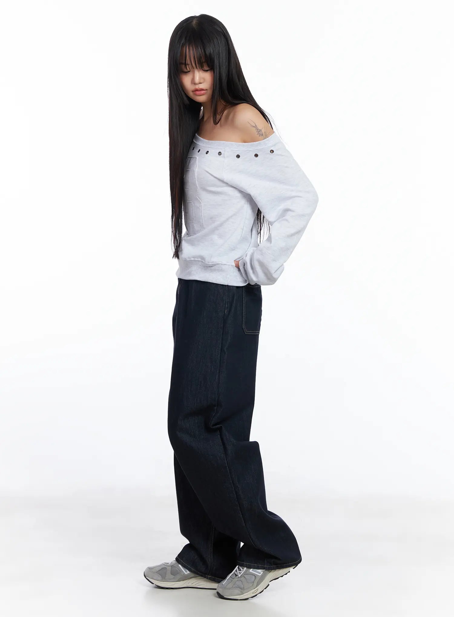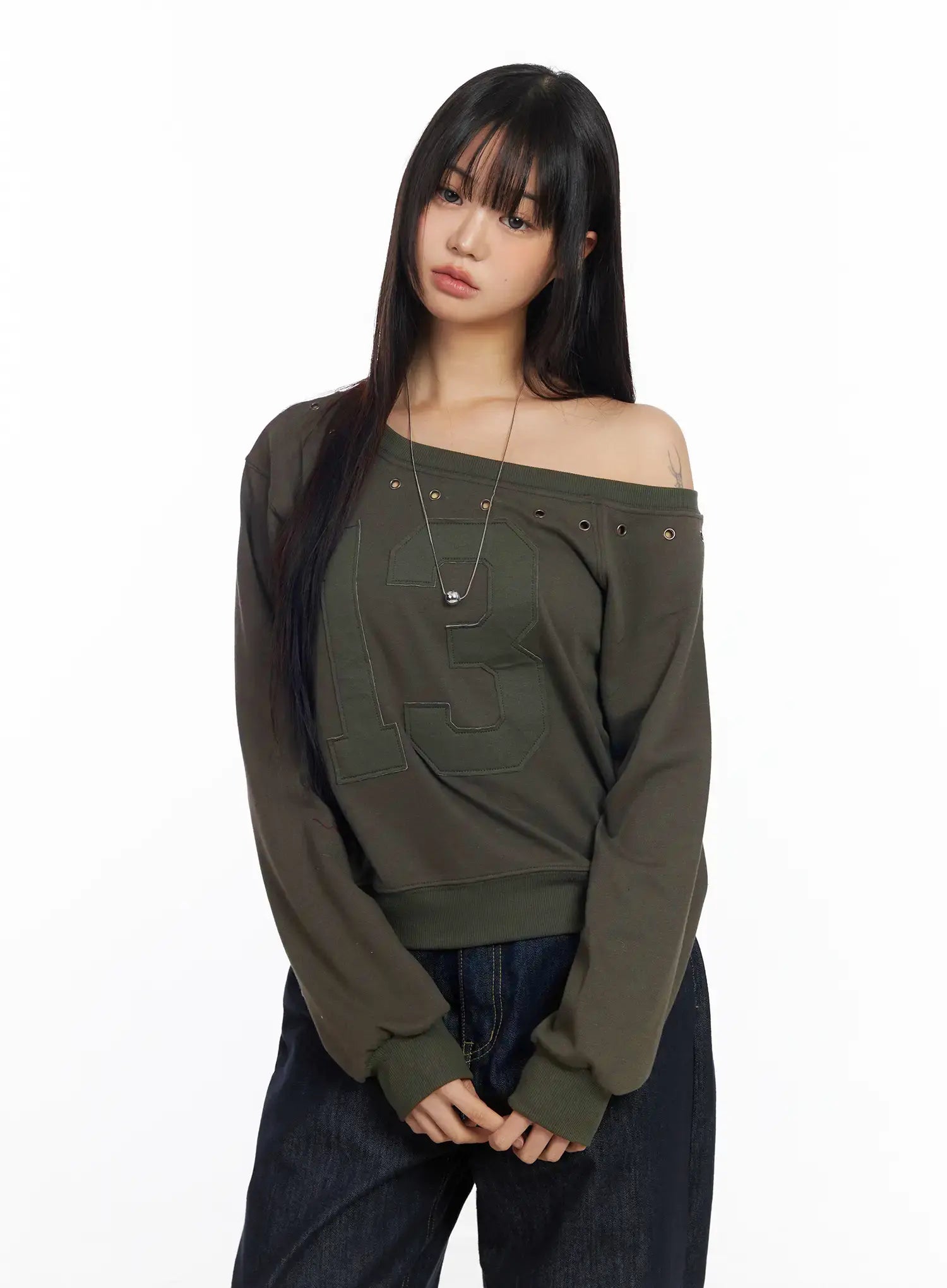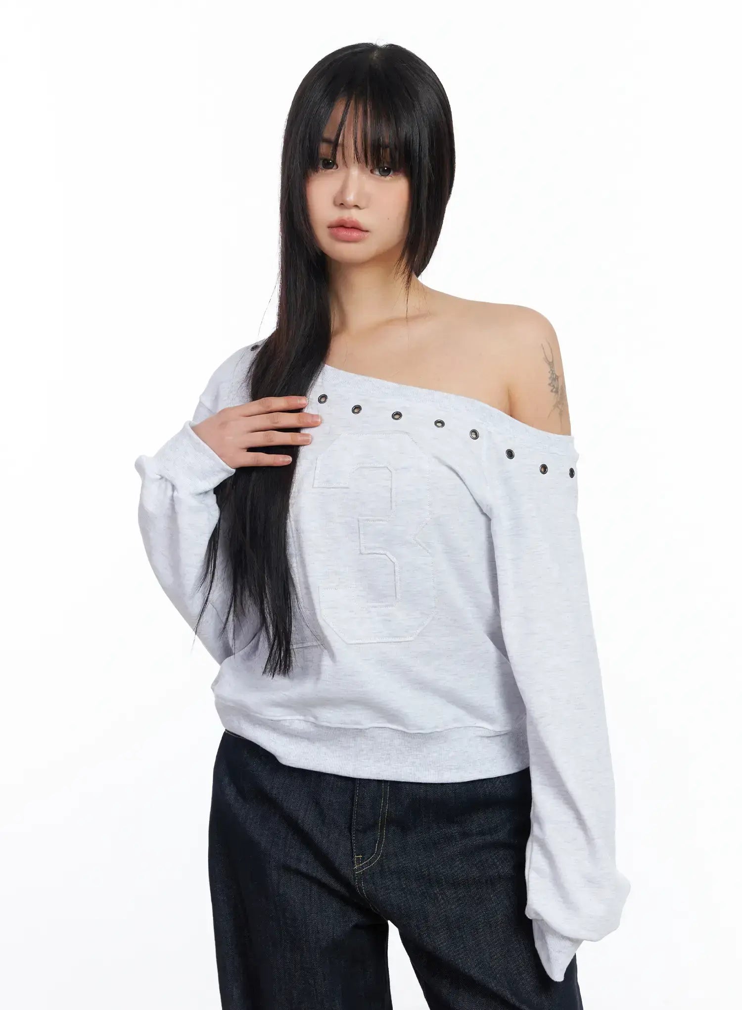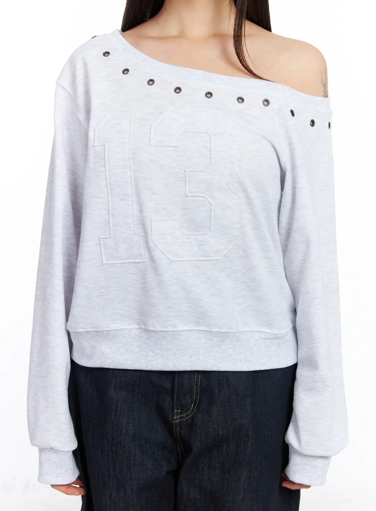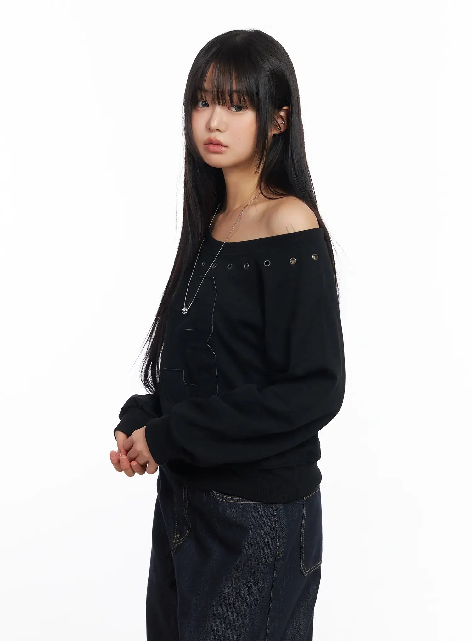 Eyelet Trimmed Off-Shoulder Sweatshirt CF504