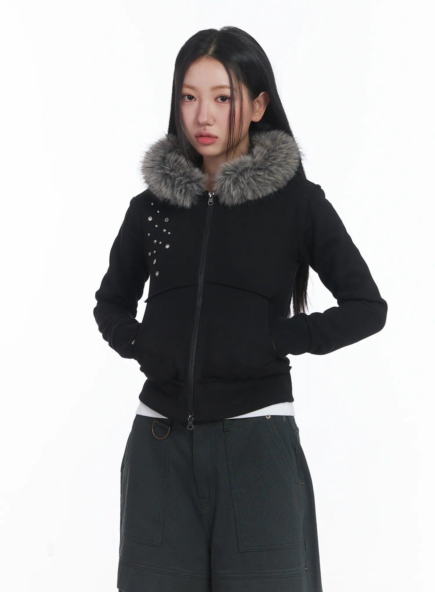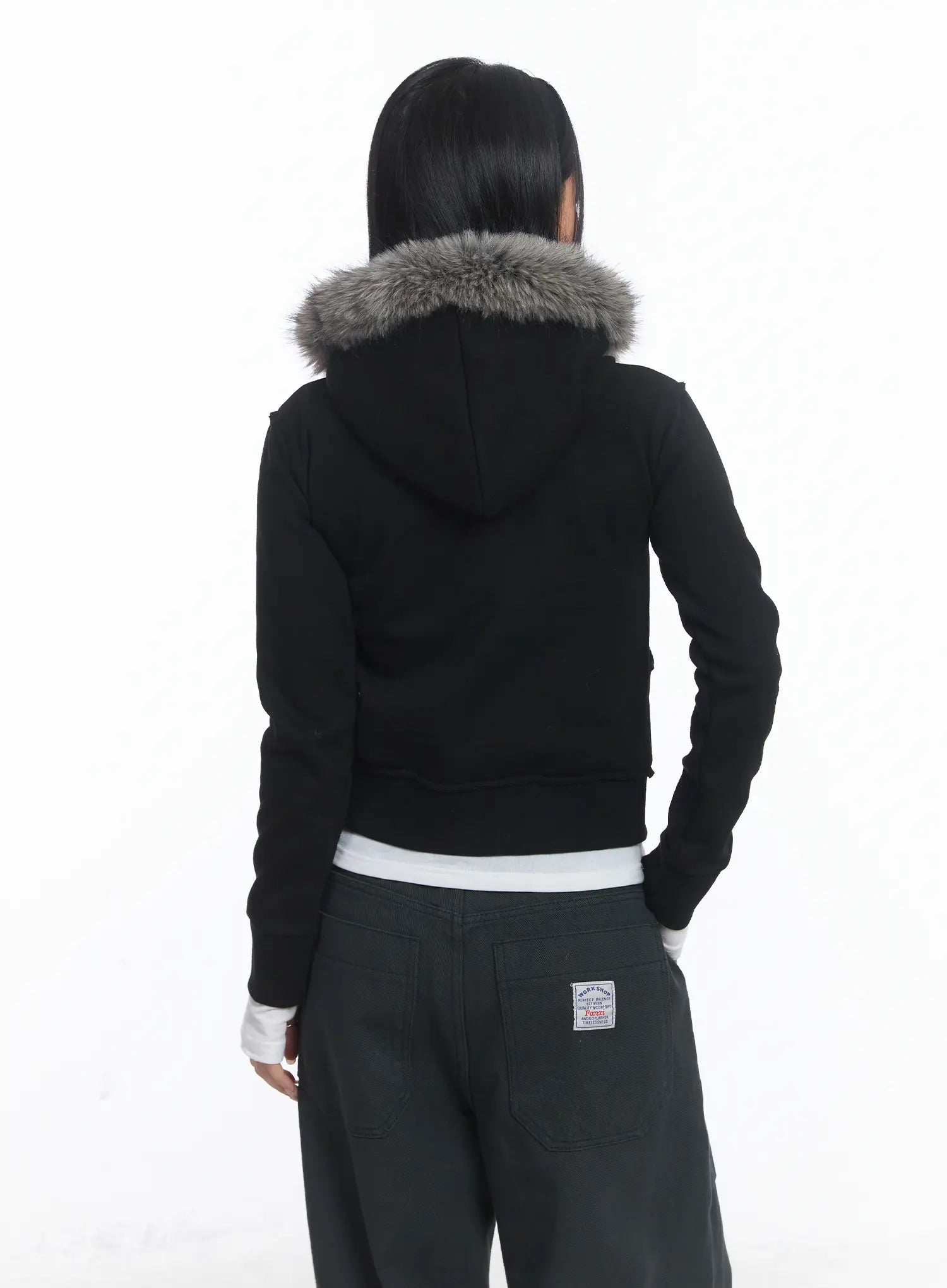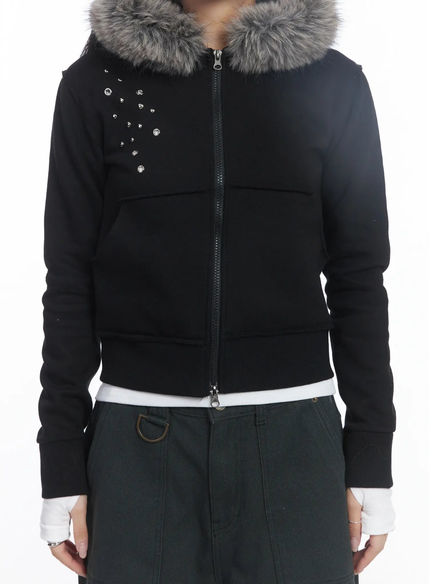 Faux Fur Fleece Eyelet Crop Hoodie CJ514