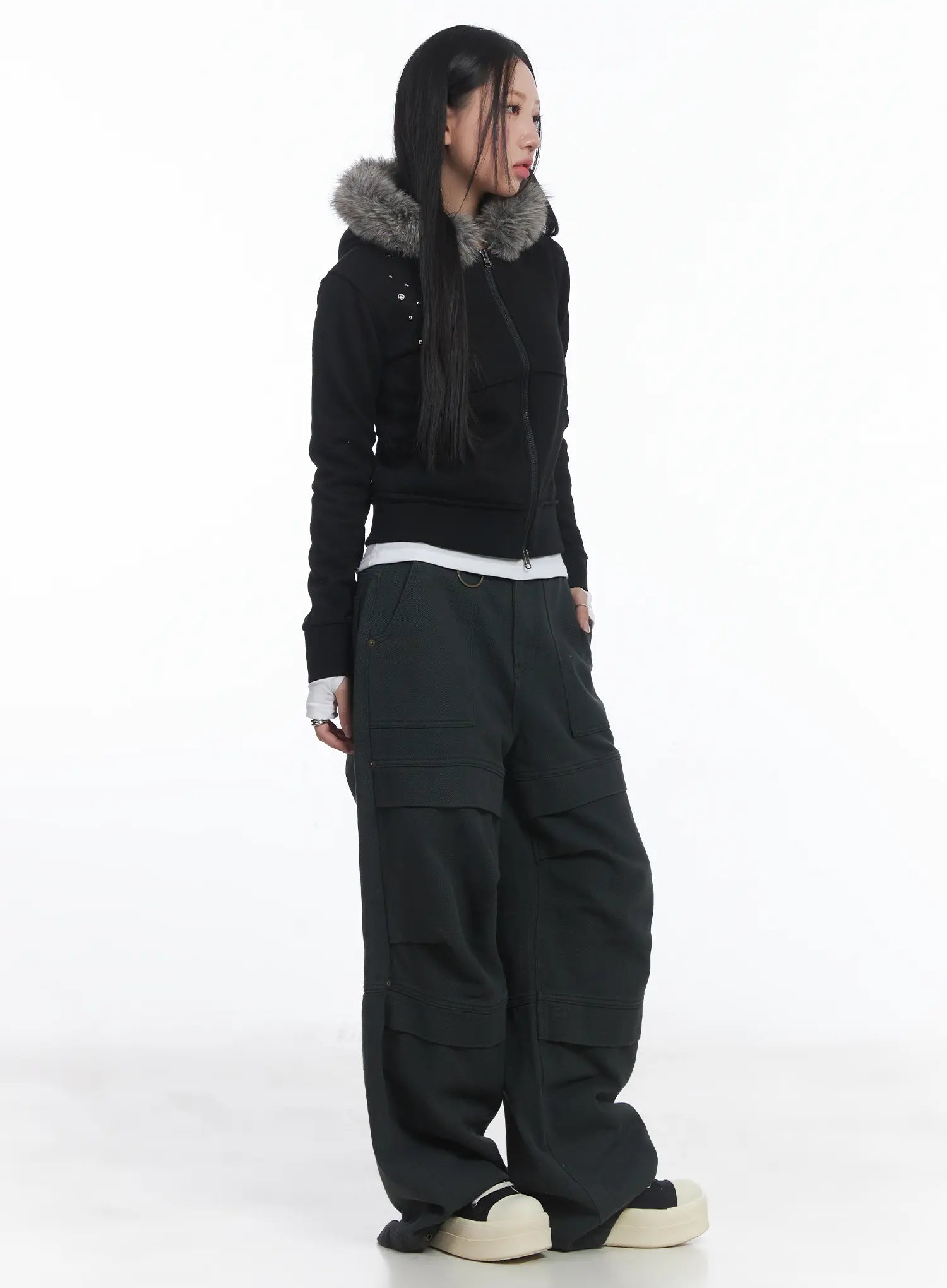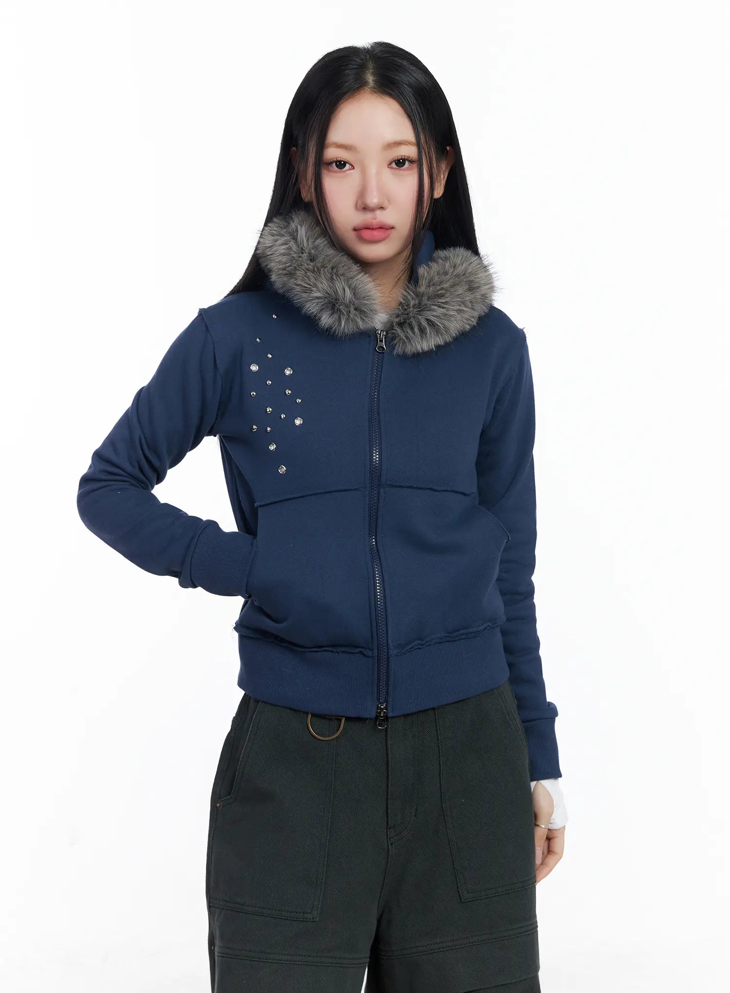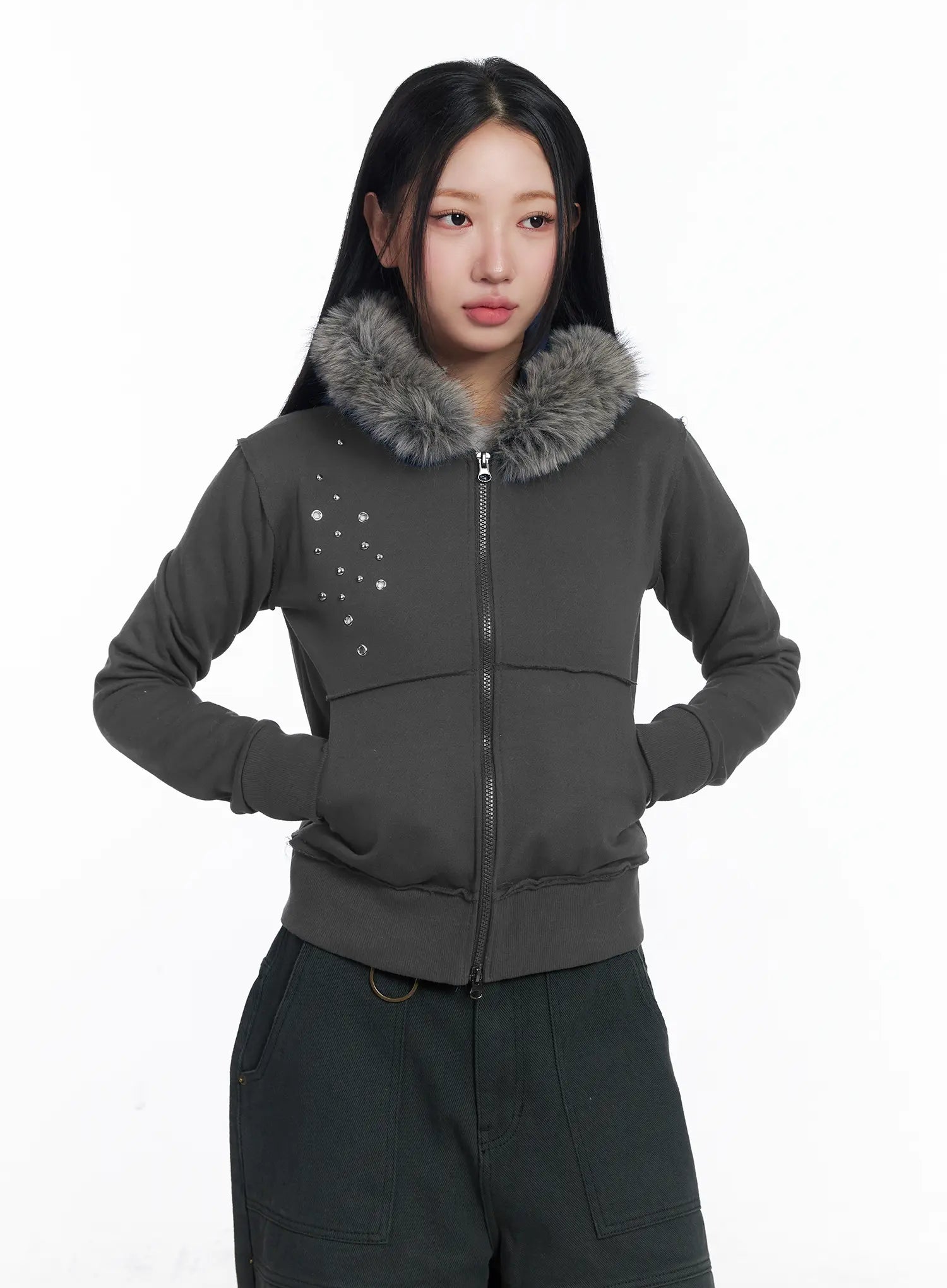 Faux Fur Fleece Eyelet Crop Hoodie CJ514