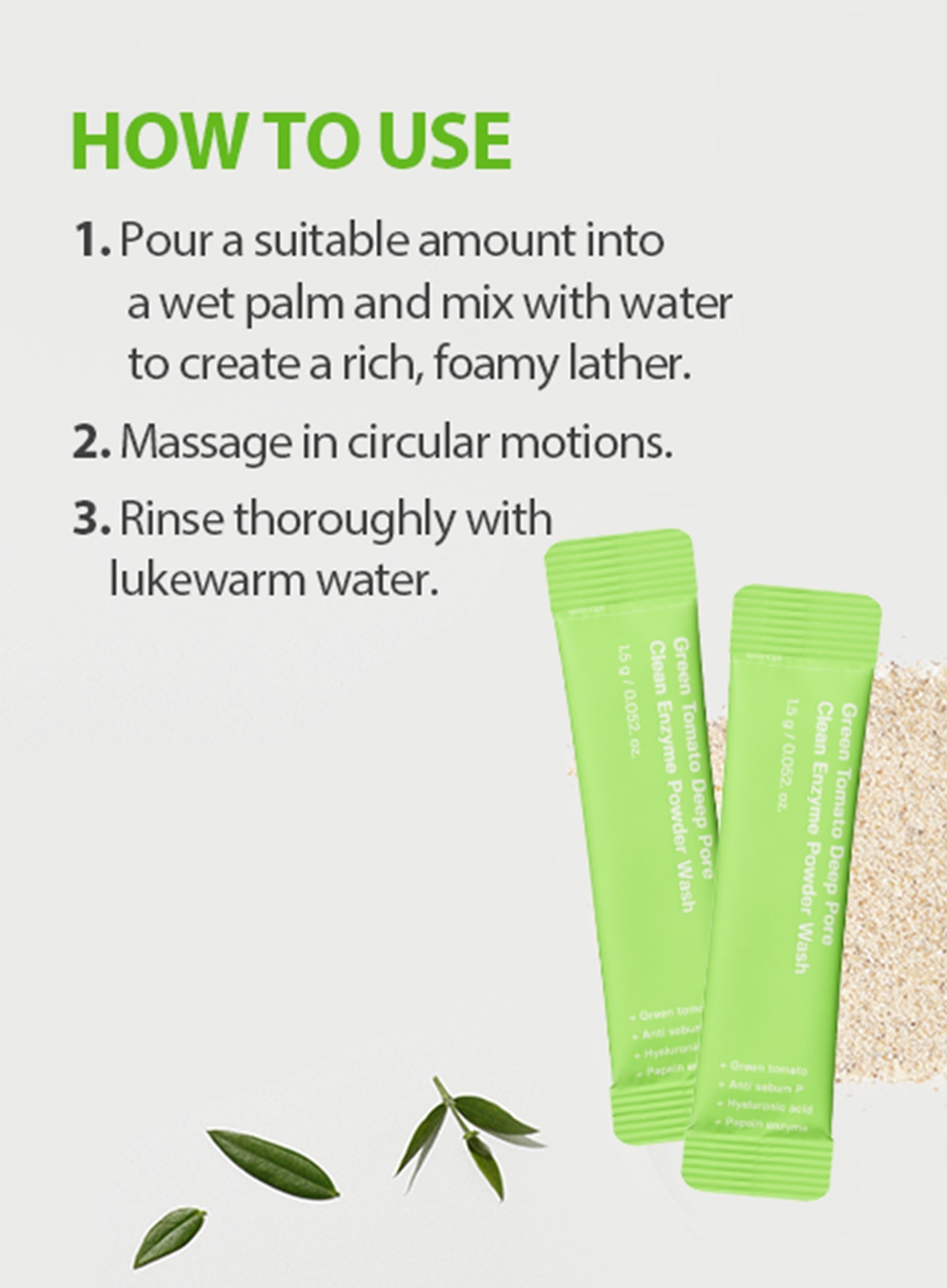 With wet hands & face, pour powder, add water to lather. Massage gently, then rinse with lukewarm water.