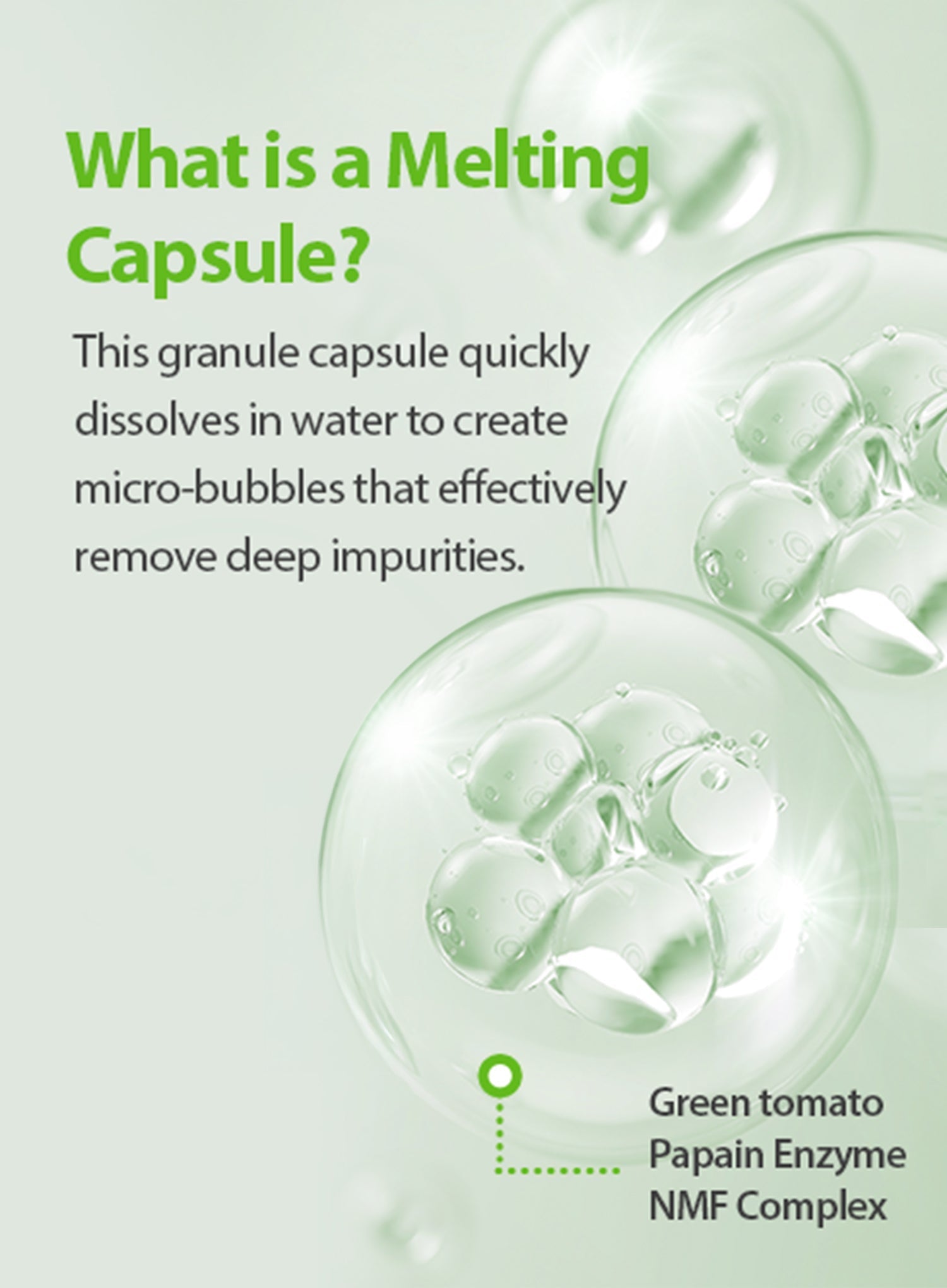 - Melting green-tomato capsules generate rich foam to remove pore waste