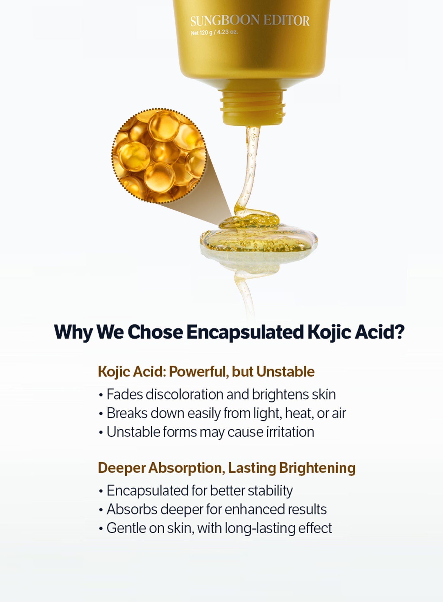 - Encapsulated kojic acid helps buff away dull cells and inhibit melanin formation