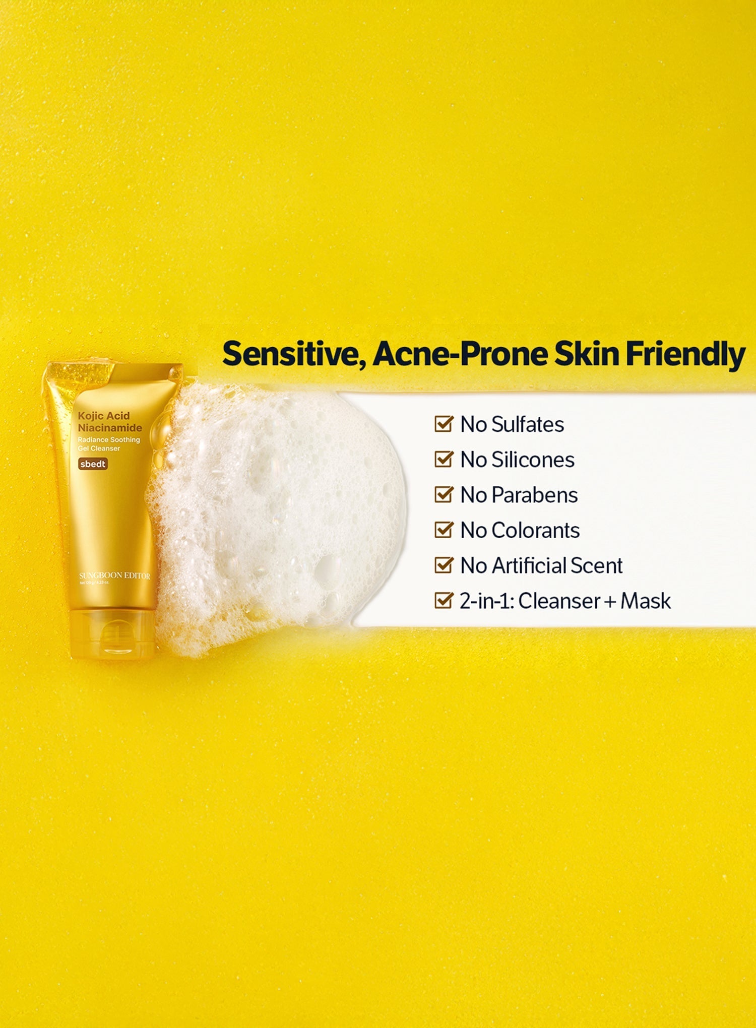 Water, Sodium C14‑16 Olefin Sulfonate, Tetradecene, Hexadecene, Lauryl Betaine, Sodium Chloride, Acrylates Copolymer, Glycerin, Cocamidopropyl Betaine, Niacinamide, Cocamide MEA, Polyquaternium‑7, Sodium Benzoate, Tromethamine, Hydroxyacetophenone, Mannitol, Microcrystalline Cellulose, Zea Mays (Corn) Starch, Titanium Dioxide (CI 77891), Kojic Acid, Melia Azadirachta Leaf Extract, Melia Azadirachta Flower Extract, Curcuma Longa (Turmeric) Root Extract, Ocimum Sanctum Leaf Extract, Corallina Officinalis Extract, Ethylhexylglycerin, Disodium EDTA, Melaleuca Alternifolia (Tea Tree) Leaf Oil, 1,2‑Hexanediol, Hydrolyzed Hyaluronic Acid, Hippophae Rhamnoides Oil, Glycine Soja (Soybean) Oil, Retinol, BHT, Panthenol, Citric Acid