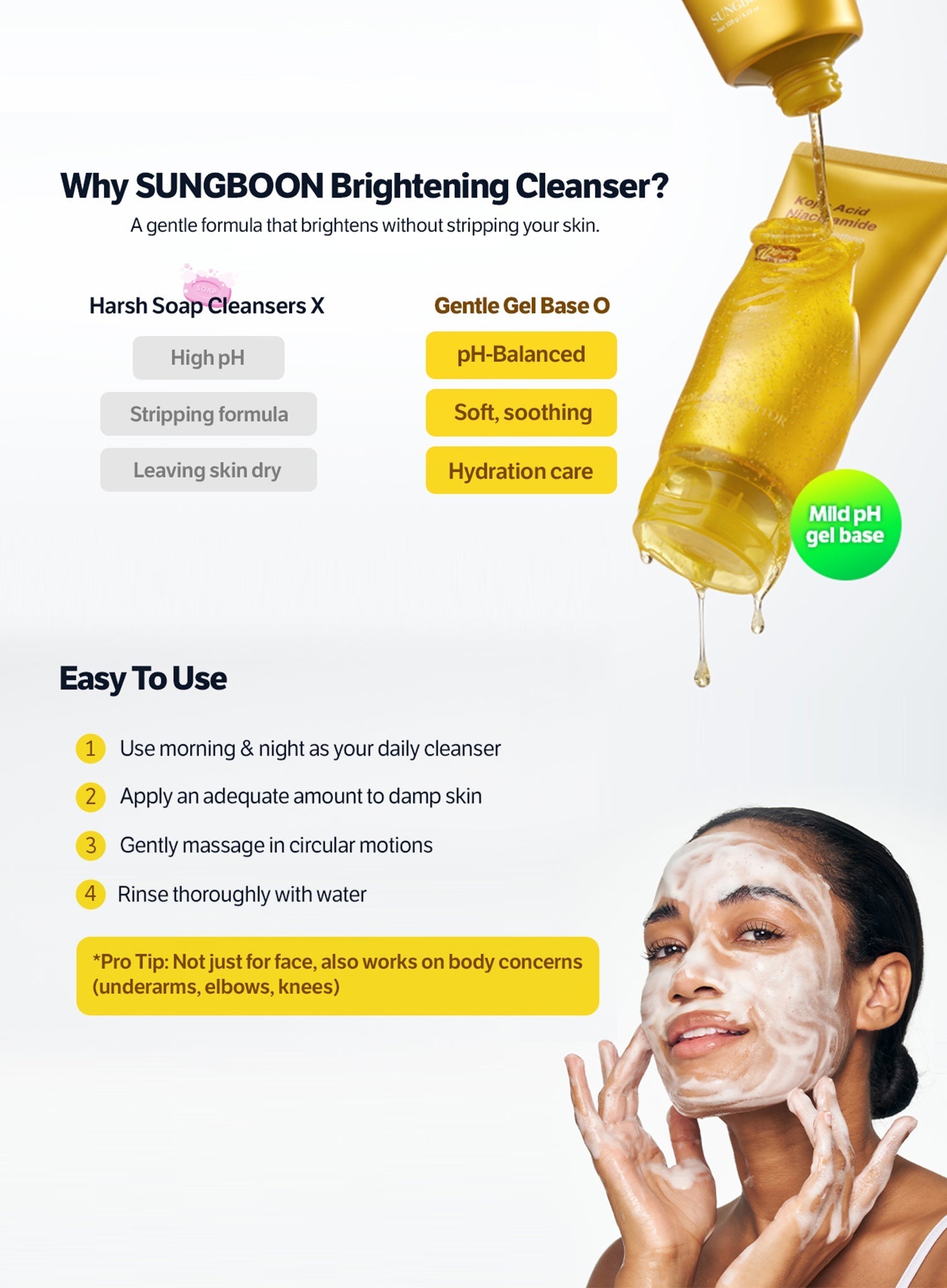 Apply an adequate amount, gently massage into wet skin, leave on 1–3 minutes for extra benefit, then rinse thoroughly