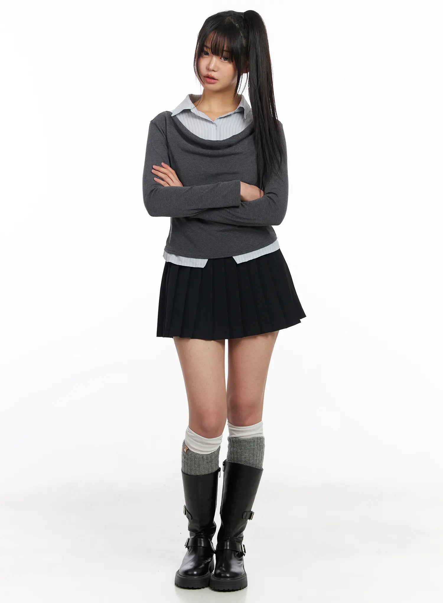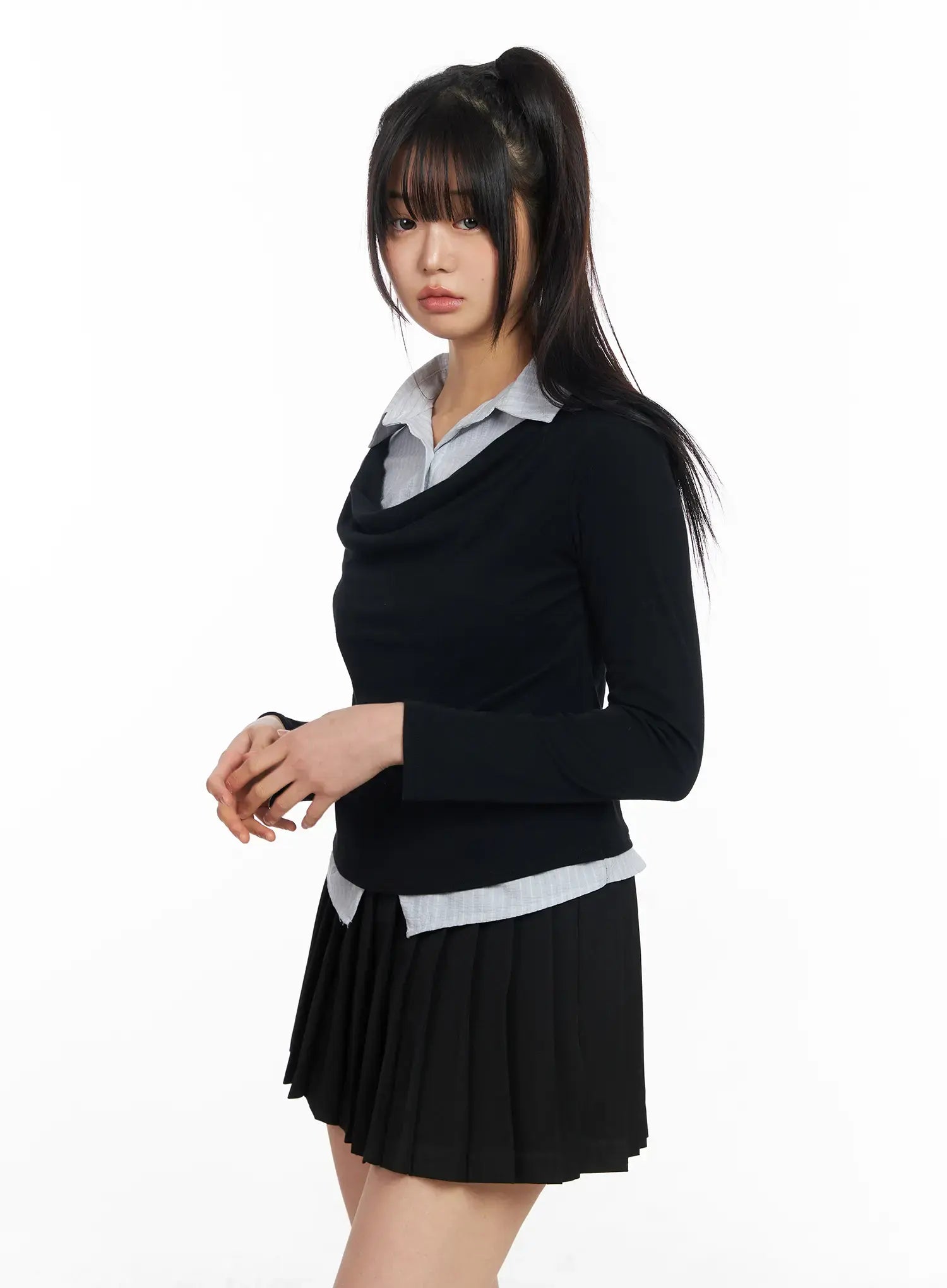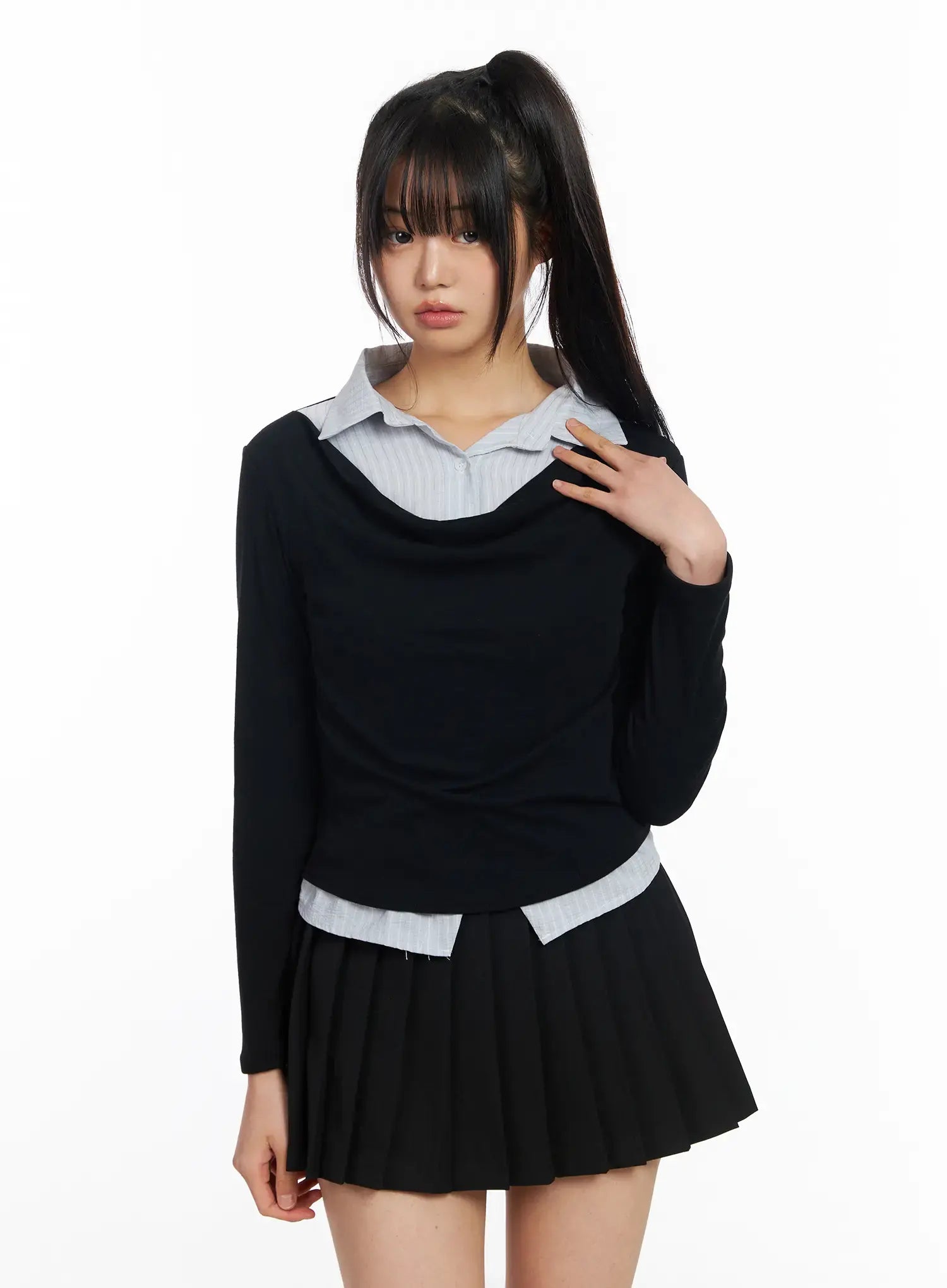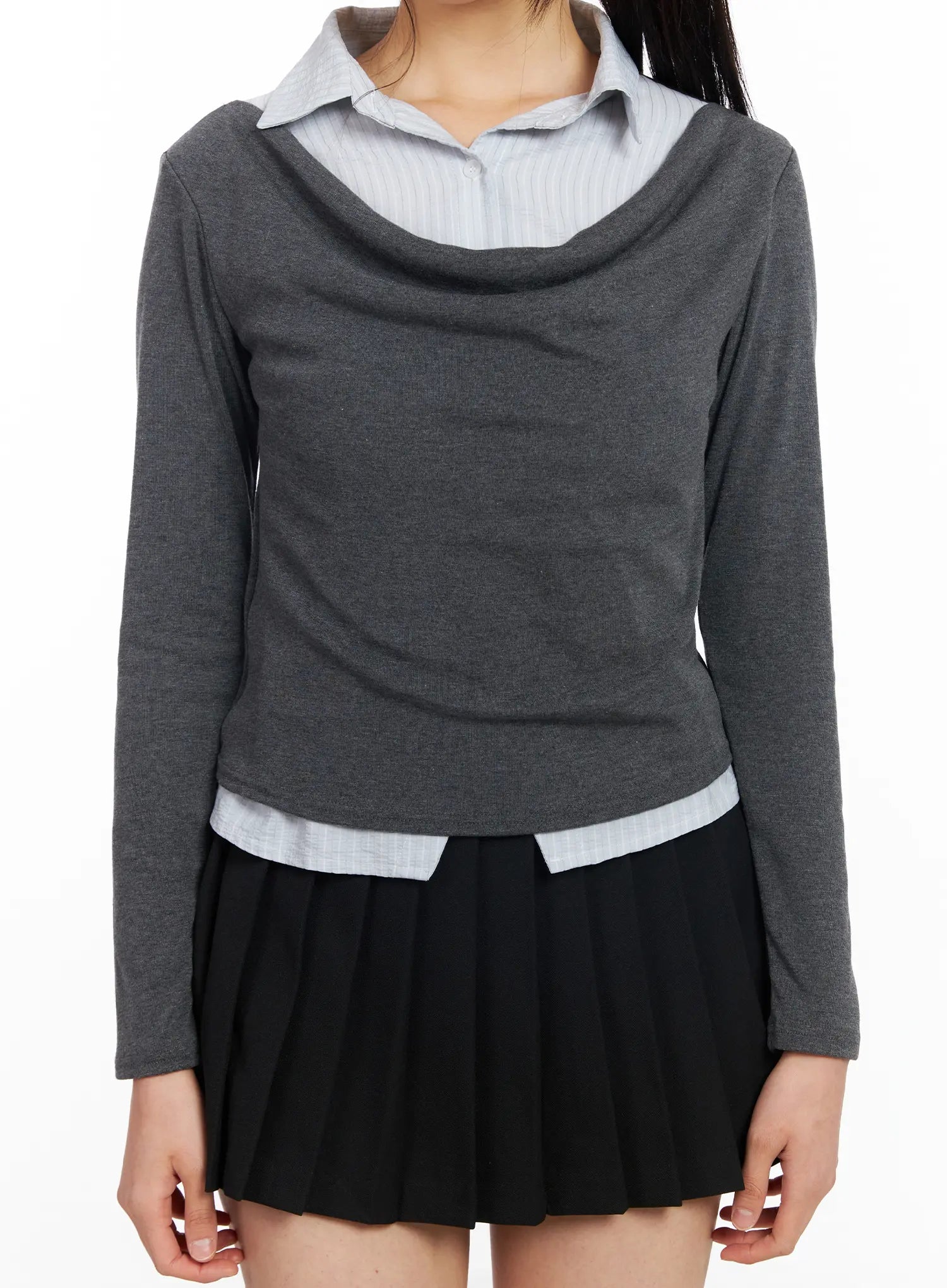 Layered Button Up Cowl Neck Long Sleeve Top CF504