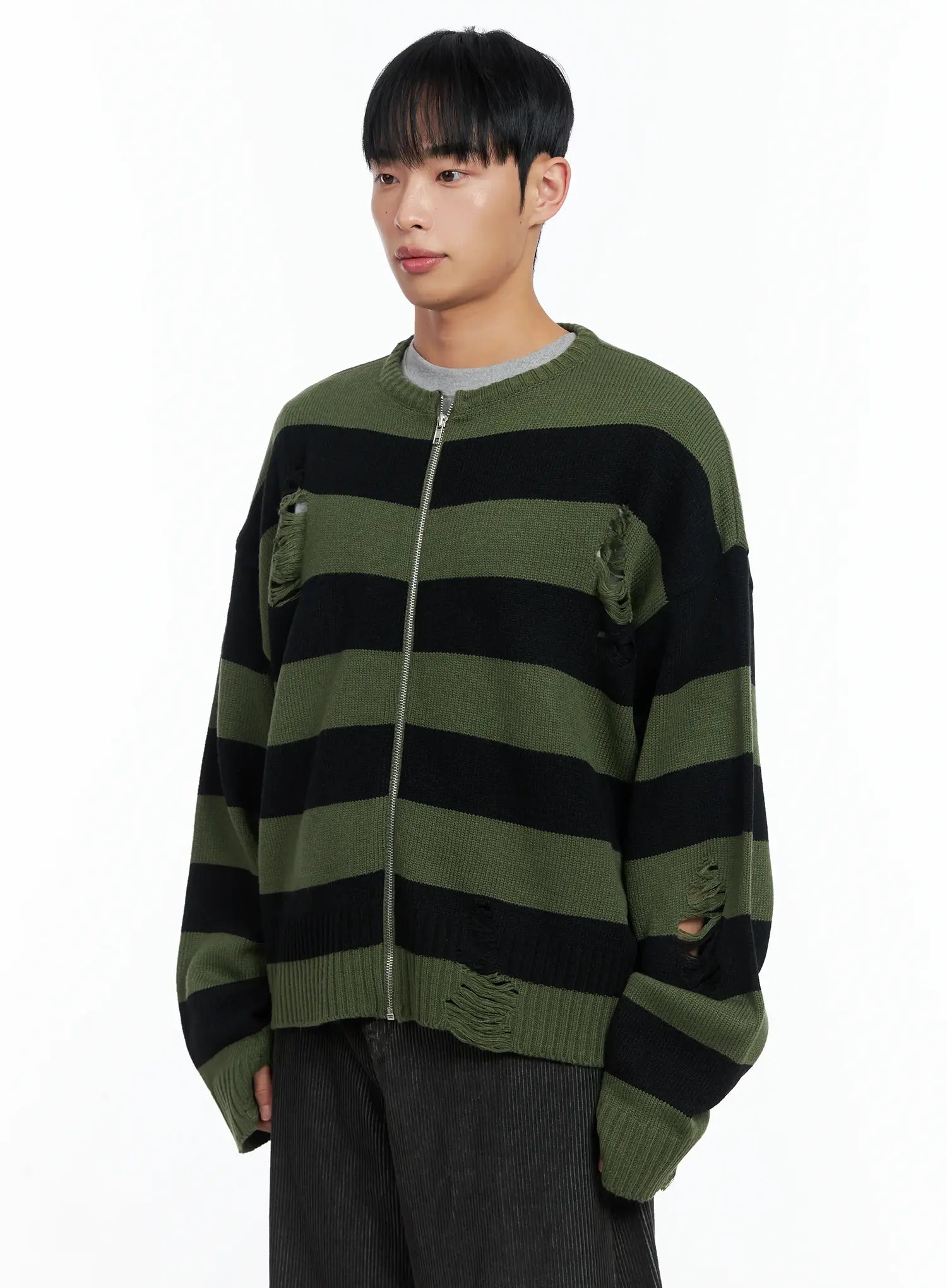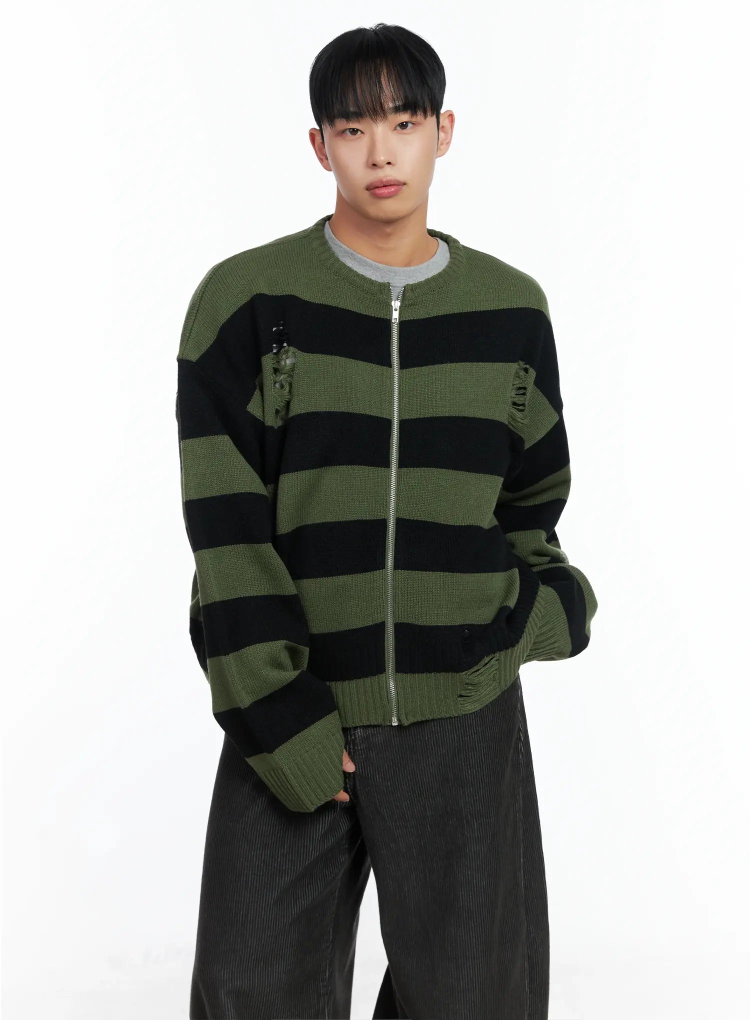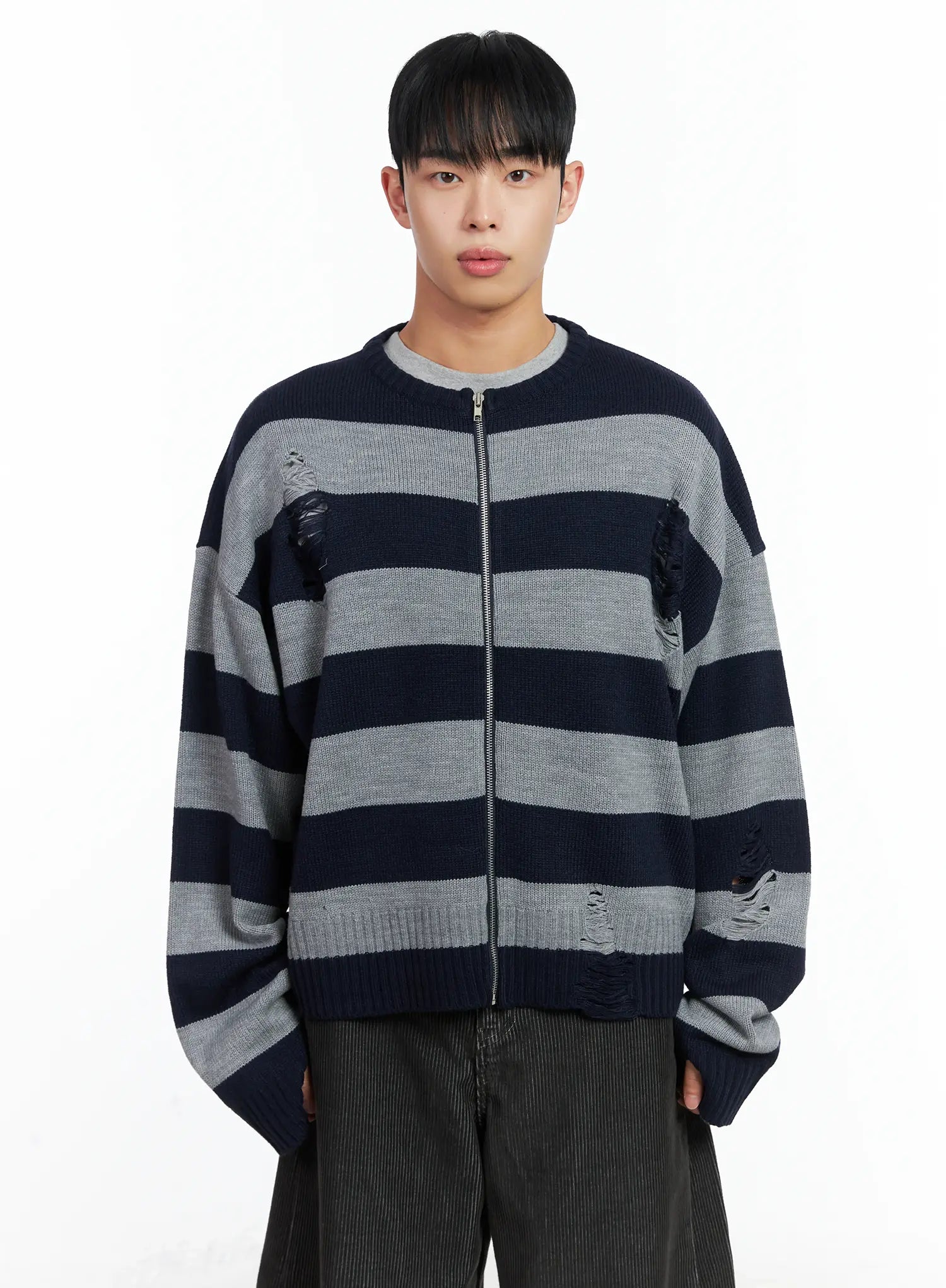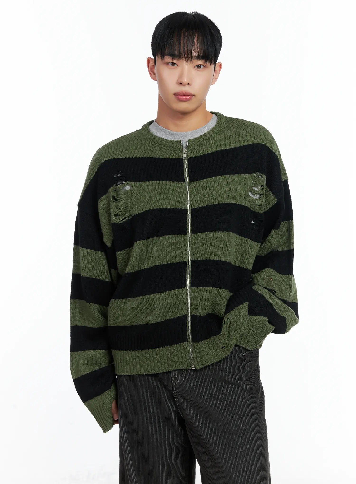 Men's Stripe Distressed Knit Cardigan IN518