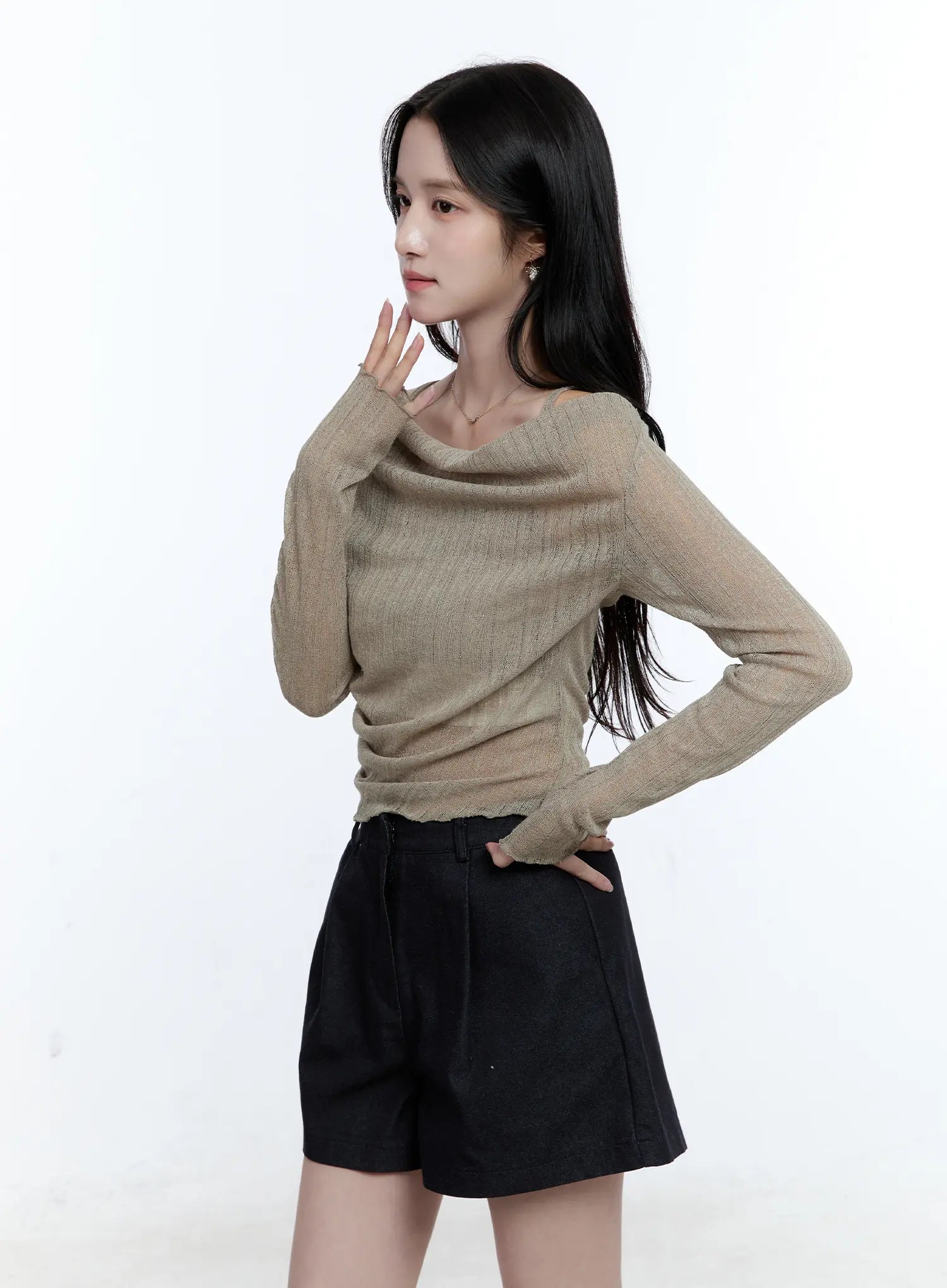 Model is wearing size S/M and the color Beige.