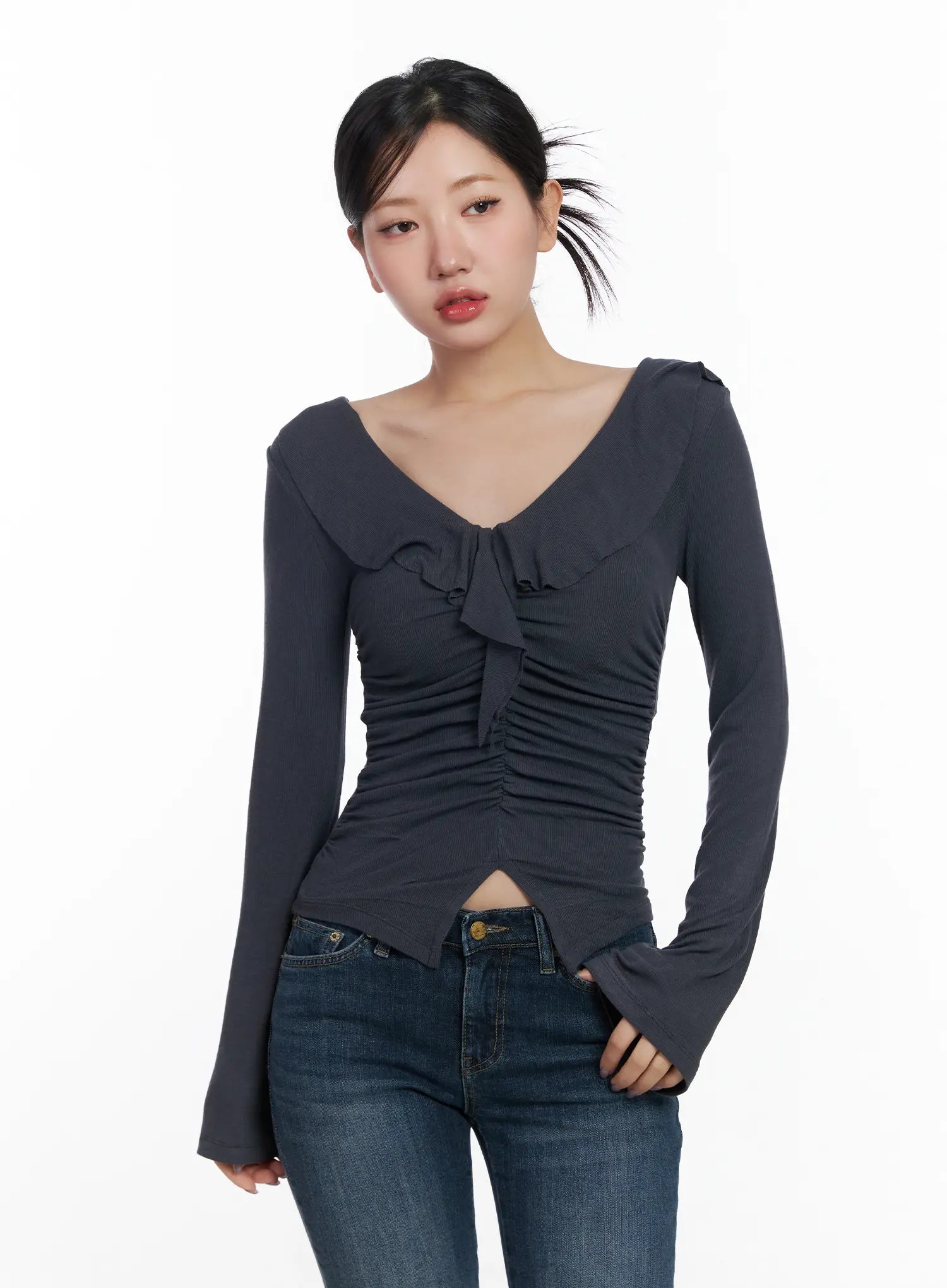 Ruffle Shirred V-Neck Long Sleeve Top CJ530