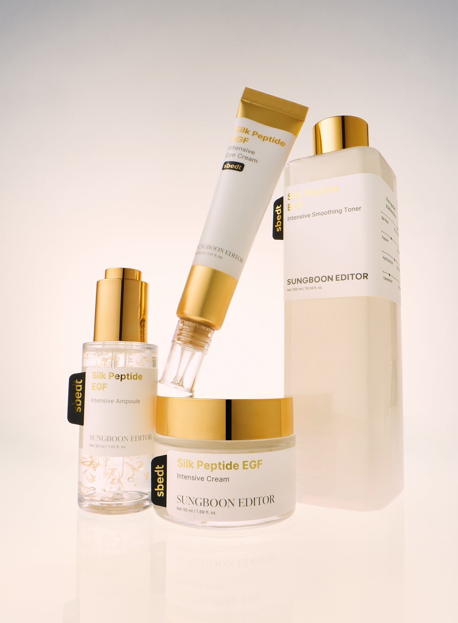 Water (Aqua), Niacinamide, Dipropylene Glycol, Diethoxyethyl Succinate, Hydroxyacetophenone, Caprylyl Glycol, Silk Water, Arginine, Carbomer, Mica, Hydroxyethylcellulose, Titanium Dioxide (CI 77891), Adenosine, Disodium EDTA, 1,2-Hexanediol, Glycerin, Butylene Glycol, Dipotassium Glycyrrhizate, Hydrolyzed Silk, Tin Oxide, Propanediol, Octyldodecanol, Hydrogenated Lecithin, Lecithin, Methylpropanediol, Ceramide NP, Melia Azadirachta Flower Extract, Ocimum Sanctum Leaf Extract, Melia Azadirachta Leaf Extract, Caprylic/Capric Triglyceride, sh-Polypeptide-121, Glycine Soja (Soybean) Peptide, Sodium Palmitoyl Sarcosinate, Curcuma Longa (Turmeric) Root Extract, Acetyl Glutamine, Benzyl Glycol, Corallina Officinalis Extract, Sodium Hyaluronate, Hydrolyzed Glycosaminoglycans, Ethylhexylglycerin, Heptasodium Hexacarboxymethyl Dipeptide-12, Bacillus/Folic Acid/Glycine Soja (Soybean) Ferment Extract, Dipeptide Diaminobutyroyl Benzylamide Diacetate, Sodium Phosphate, Dextran, Benzoic Acid, Sodium Benzoate, Sodium Hyaluronate Crosspolymer, Silk Amino Acids, Silk Extract, Hydrolyzed Elastin, Myristoyl Pentapeptide-17, Myristoyl Pentapeptide-4, sh-Polypeptide-123, Hydrolyzed Hyaluronic Acid, Palmitoyl Pentapeptide-5, Acetyl Tetrapeptide-3, Trifolium Pratense (Clover) Flower Extract, Copper Tripeptide-1, Atelocollagen, Palmitoyl Pentapeptide-4, Desamido Collagen, Hydroxypropyltrimonium Hyaluronate, Acetyl Hexapeptide-8, Caffeoyl Hexapeptide-65, Hydrolyzed Collagen, Palmitoyl Tetrapeptide-7, sh-Decapeptide-7, sh-Octapeptide-4, sh-Oligopeptide-9, sh-Pentapeptide-19, Palmitoyl Tripeptide-1, Soluble Collagen, Collagen, Collagen Amino Acids, Hyaluronic Acid, Tripeptide-32, SR (Oligopeptide-91, Clostridium Botulinum Polypeptide-1), sh-Oligopeptide-1, sh-Polypeptide-1, sh-Oligopeptide-2, sh-Polypeptide-11, sh-Polypeptide-9, Procollagen, Sodium Acetylated Hyaluronate, sh-Polypeptide-16, sh-Polypeptide-22, sh-Polypeptide-3, sh-Polypeptide-19, sh-Polypeptide-62
