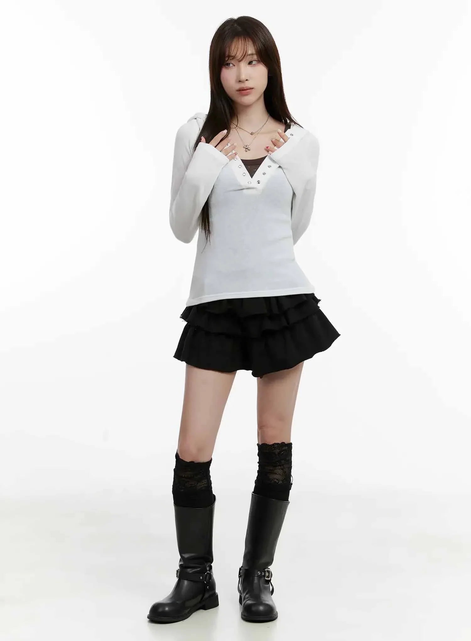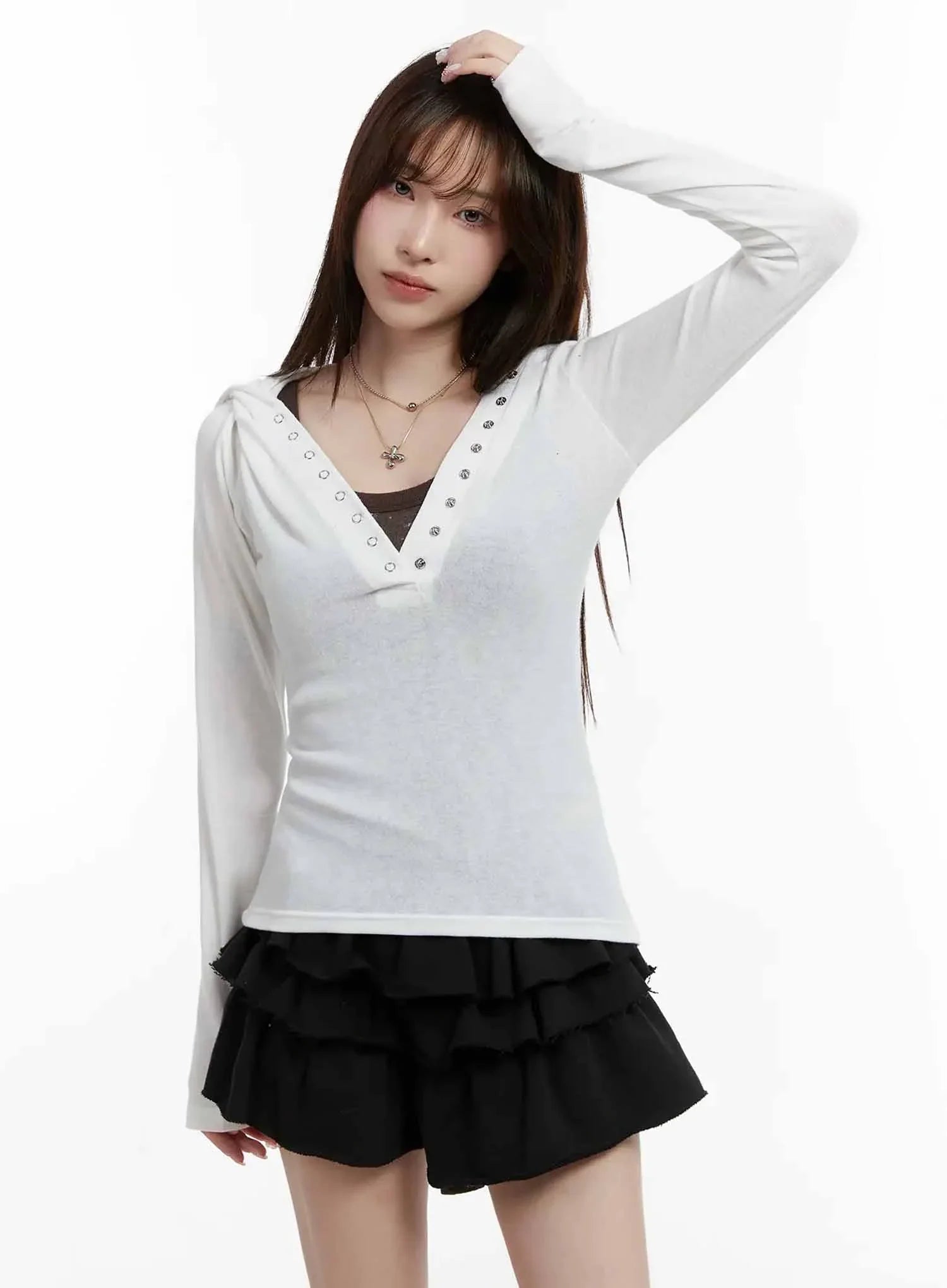 V Neck Button Slim Hooded Top IJ516